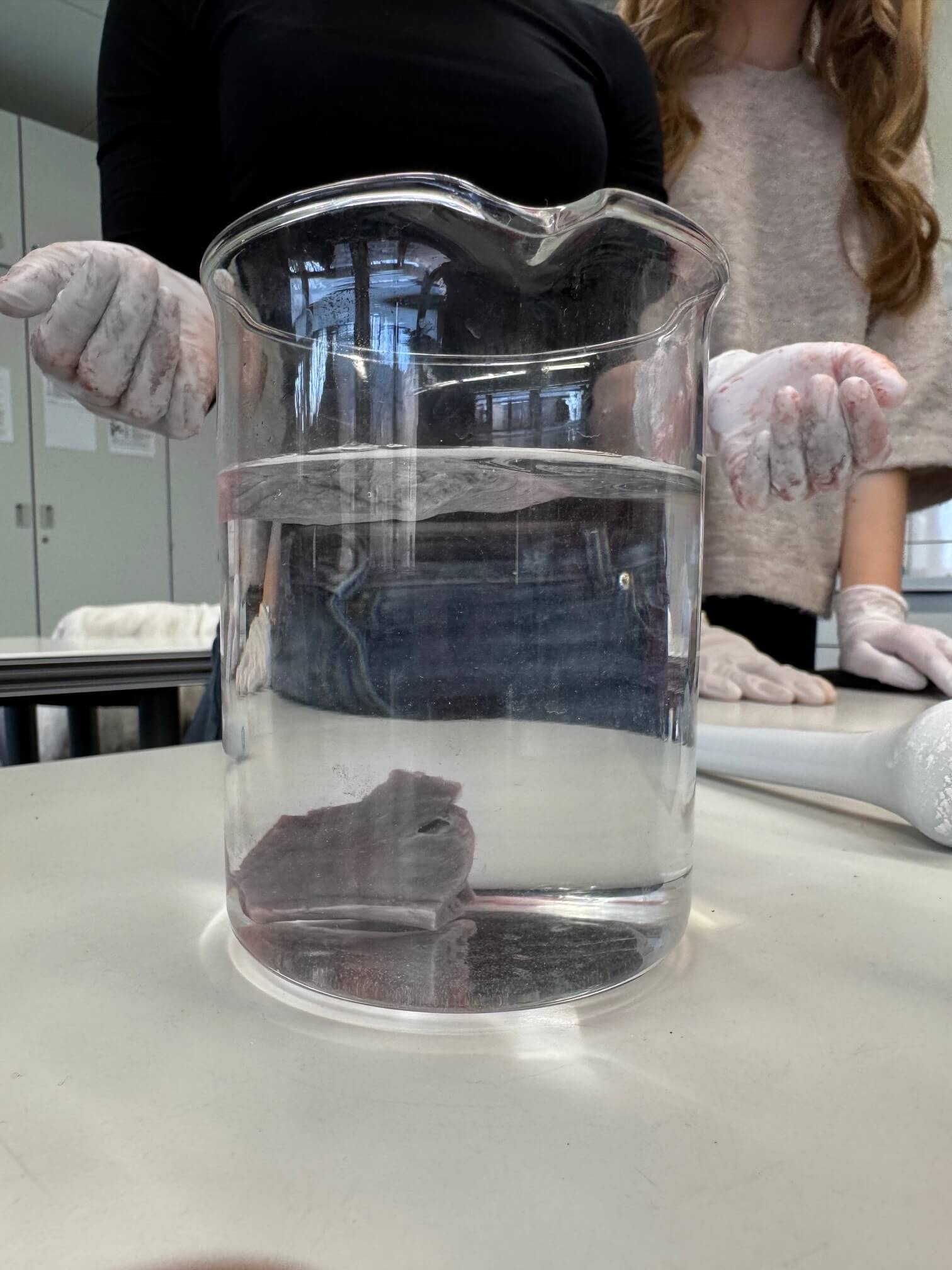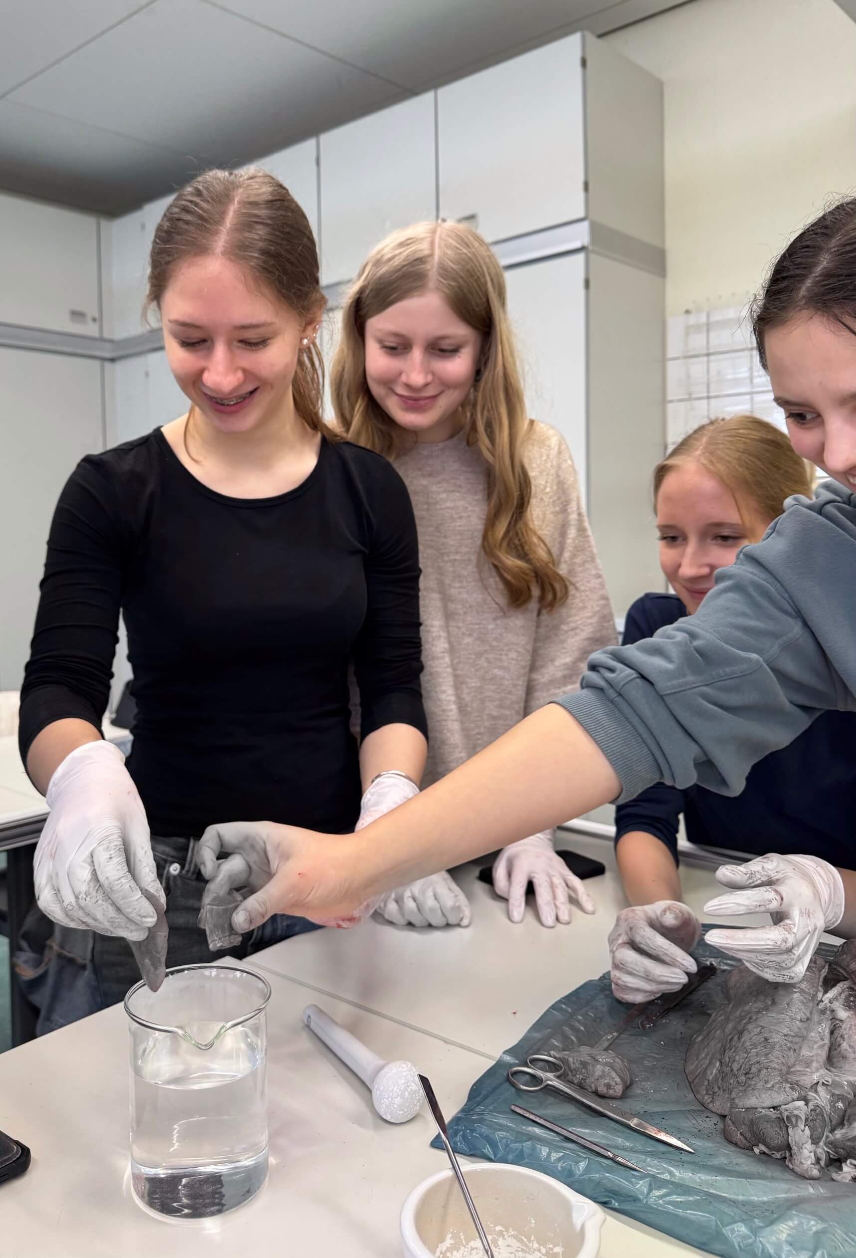 Besonders faszinierend war es, die Strukturen nicht nur zu betrachten, sondern aktiv zu erforschen. Mithilfe von Kreidestaub wurde der Weg der Luft innerhalb der Luftröhre und Bronchien sichtbar gemacht – ein Experiment, das die Verzweigungen des Atmungssystems eindrucksvoll demonstrierte. Mit einem Schlauch gelang es den Schülerinnen und Schülern zudem, die Lunge vorsichtig wieder zu entfalten und so die Funktionsweise der Belüftung unmittelbar zu erleben.