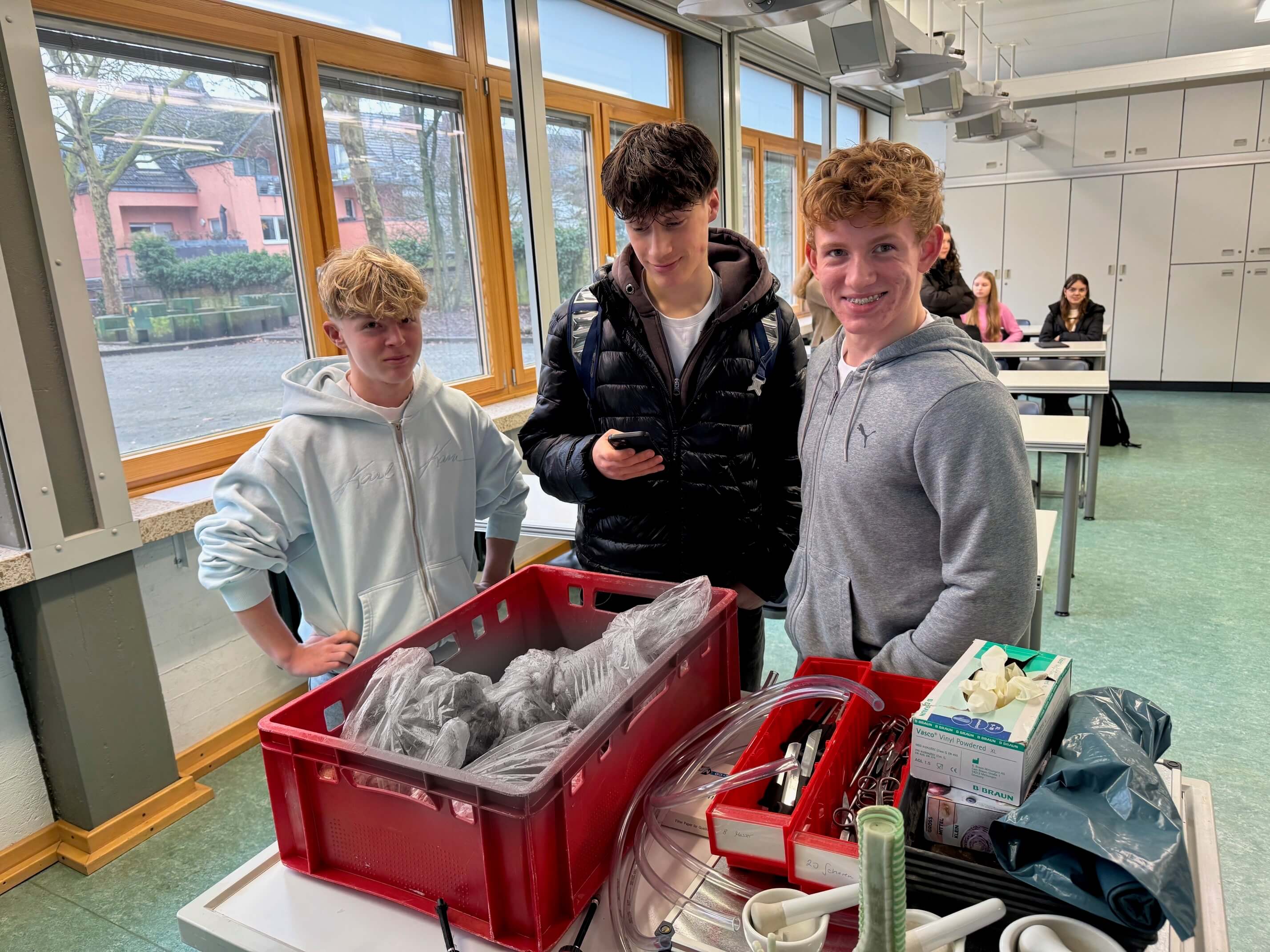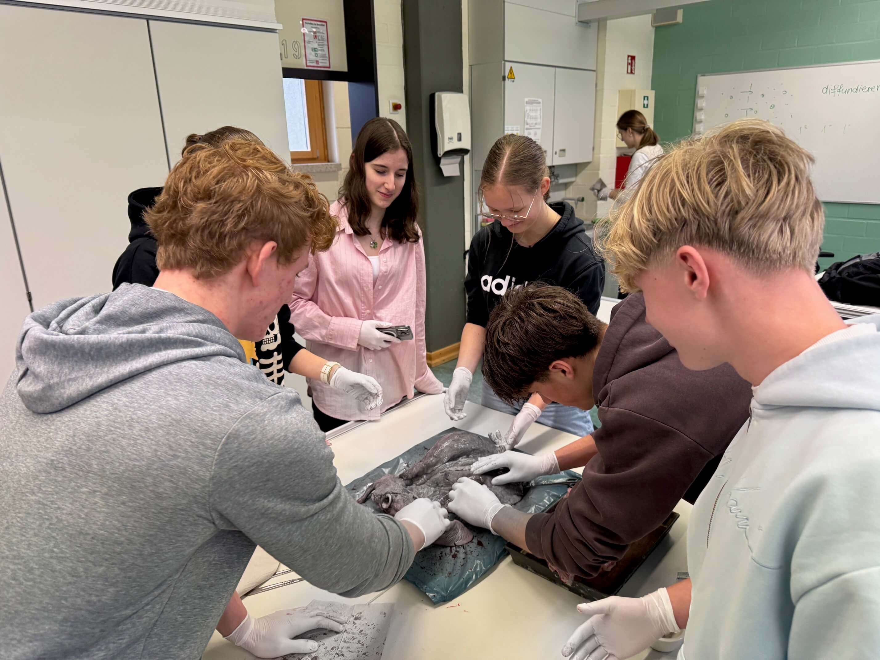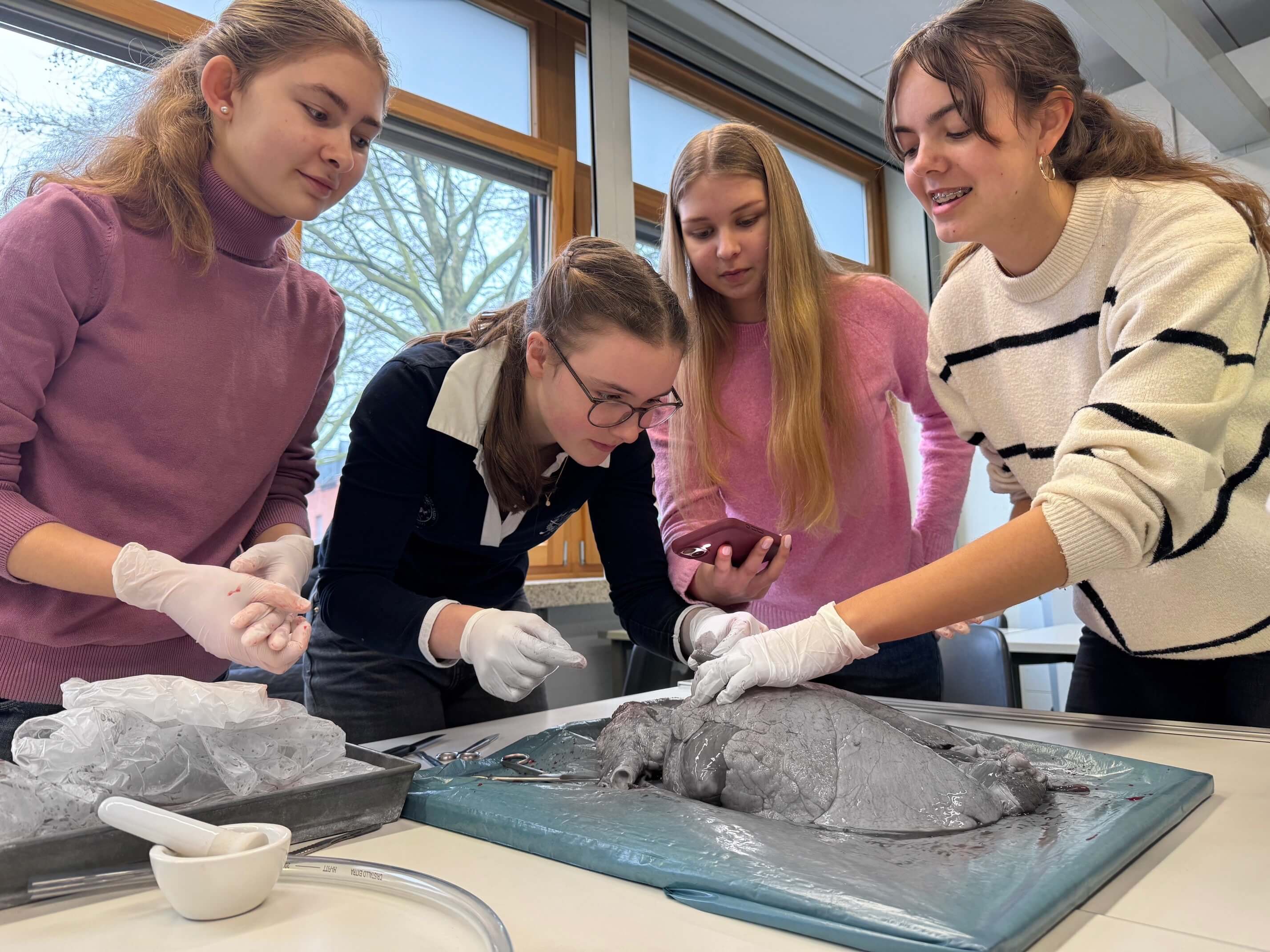 Im Differenzierungskurs Sportmedizin der Jahrgangsstufe 10 wurde der Unterricht kürzlich besonders anschaulich – und im wahrsten Sinne des Wortes „begreifbar“. Im Rahmen einer praktischen Einheit sezierten die Schülerinnen und Schüler eine Schweinelunge, um Aufbau und Funktion der Atmungsorgane aus nächster Nähe zu untersuchen.