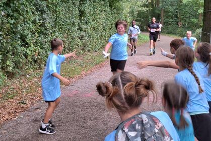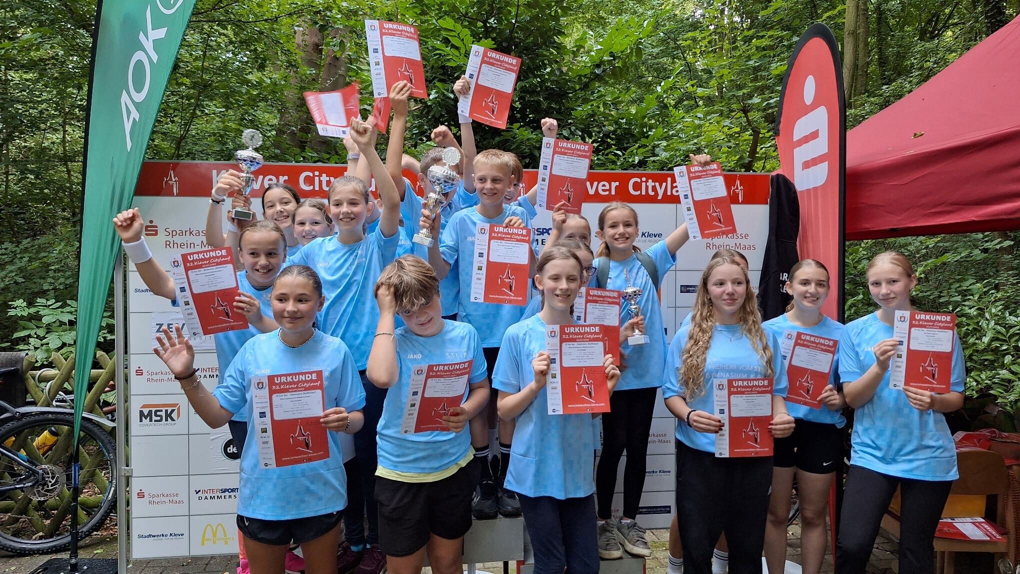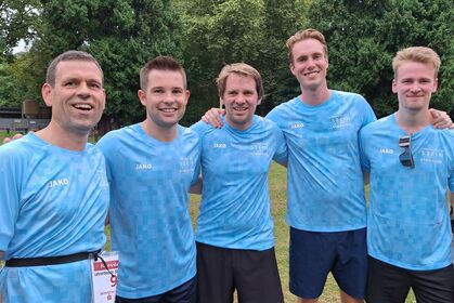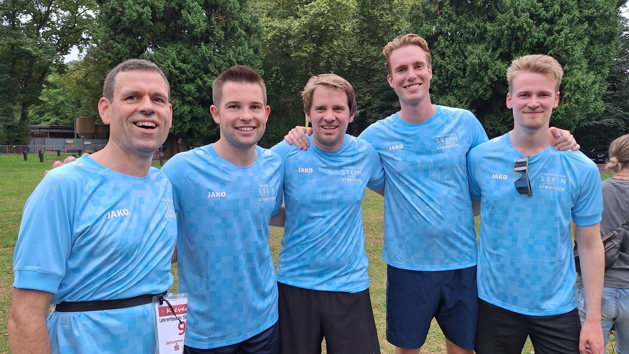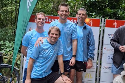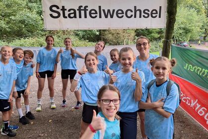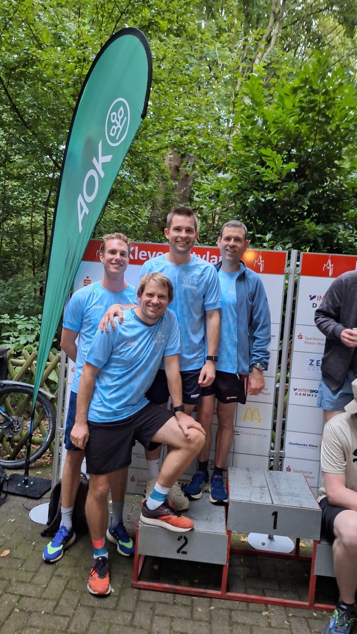 Unsere beiden Lehrerteams machten sich ebenfalls richtig gut, auch Dank des Einspringens einiger Angehöriger. 2. Platz bei den Männern für Herrn Kluge, Herrn Olschewski, Herrn Weingarten, Leander Runde und Herrn Birkemeier (41:51). Herr Kluge lief die schnellste Zeit (7:40 Min.) und anschließend gleich noch einmal für seinen Triathlon-Verein. Er musste sich bei der Siegerehrung auf dem Podest quasi zweiteilen. Und 3. Platz für die Mixed-Staffel mit Herrn Meurs, Frau Schubert, Frau Moerkerk, Sophie Kimritz und Lena Birkemeier (58:32 Min.).