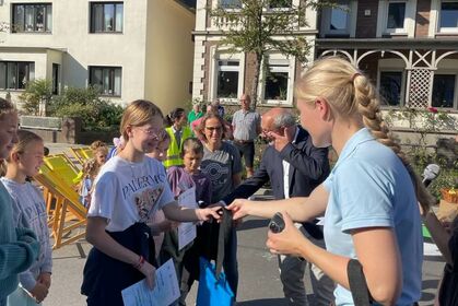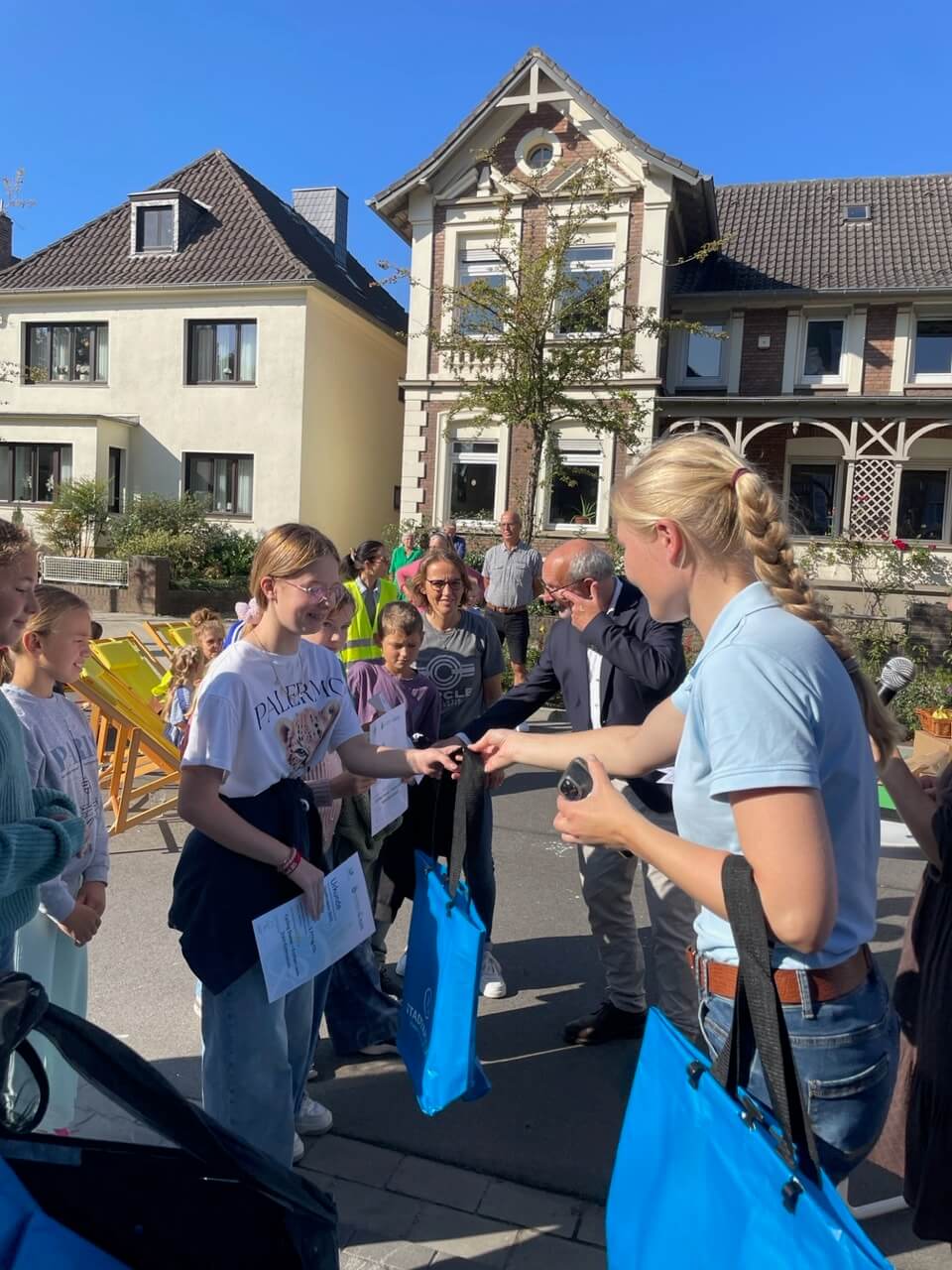 Inmitten der begeistert spielenden Kinder lobte Bürgermeister Wolfgang Gebing den Einsatz aller Radler. Mit einer erradelten Kilometerzahl von 35.228km vermieden die Cycling Stones nicht nur 5.777kg CO2, sondern schafften auch die meisten Kilometer aller Teams der Stadt Kleve.