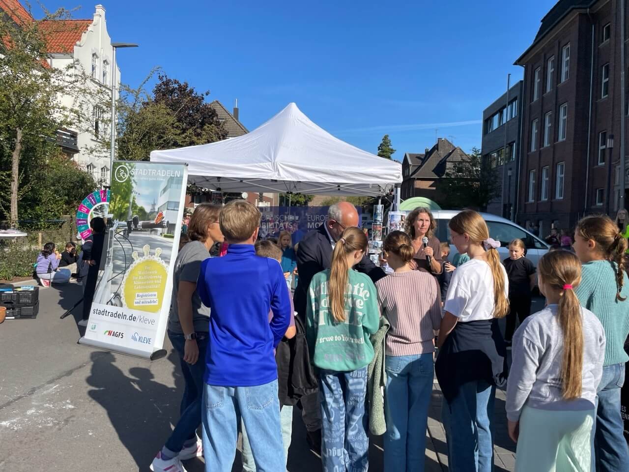 Stellvertretend für alle motivierten Cycling Stones unserer Schule durften die besten Radler der 6c zusammen mit Frau Moerkerk an der Siegerehrung des Stadtradelns der Stadt Kleve teilnehmen. Im Rahmen der europäischen Mobilitätswoche wurde die Spyckstraße vor der Montessorischule für den Durchgangsverkehr gesperrt und in eine Spielstraße umgewandelt.
