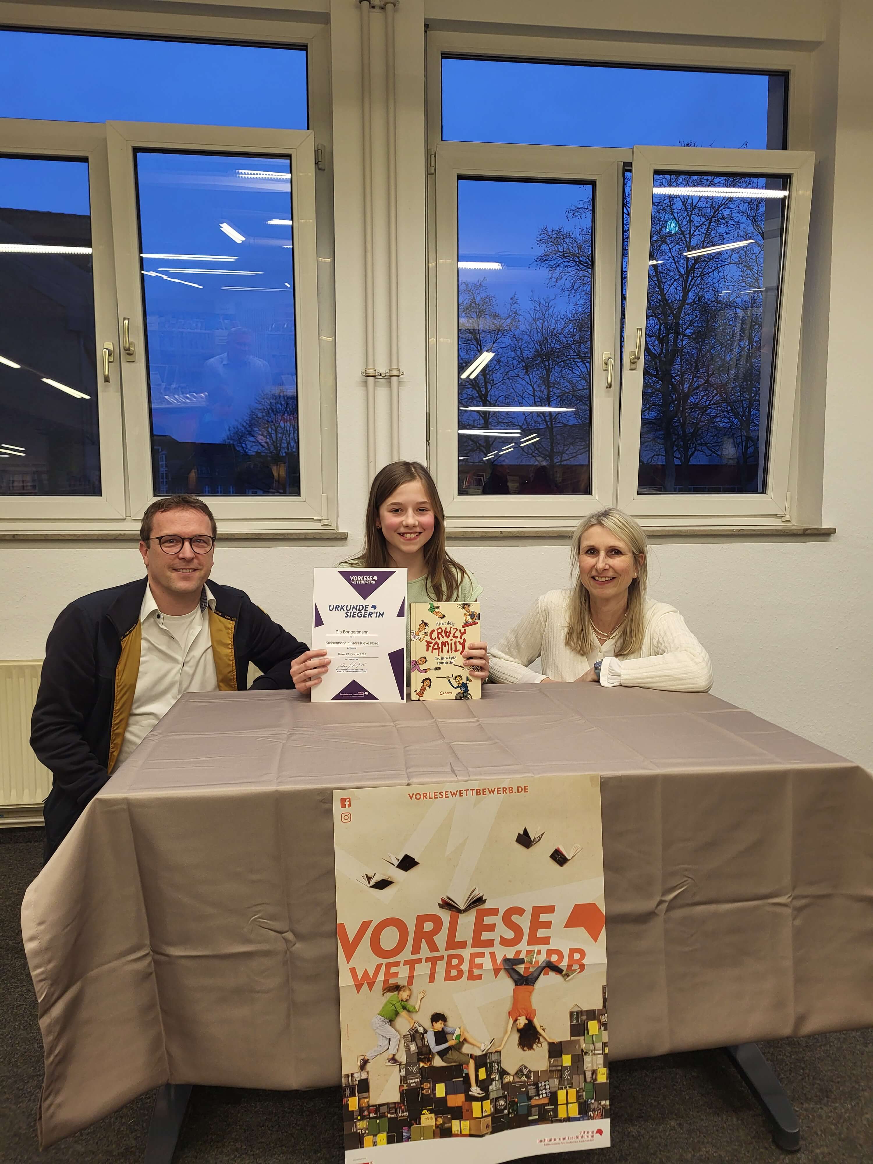 Sie trat gegen elf weitere Schulsiegerinnen und Schulsieger aus dem Nordkreis an. Mit klarer Stimme, sicherer Betonung und ganz viel Ausdruck begeisterte sie die Jury mit ihrem vorbereiteten, witzigen Textauszug aus dem Buch „Crazy Family“ (von Markus Orths). Auch die dreiminütige Lesezeit für den Fremdtext absolvierte sie mit Bravour.