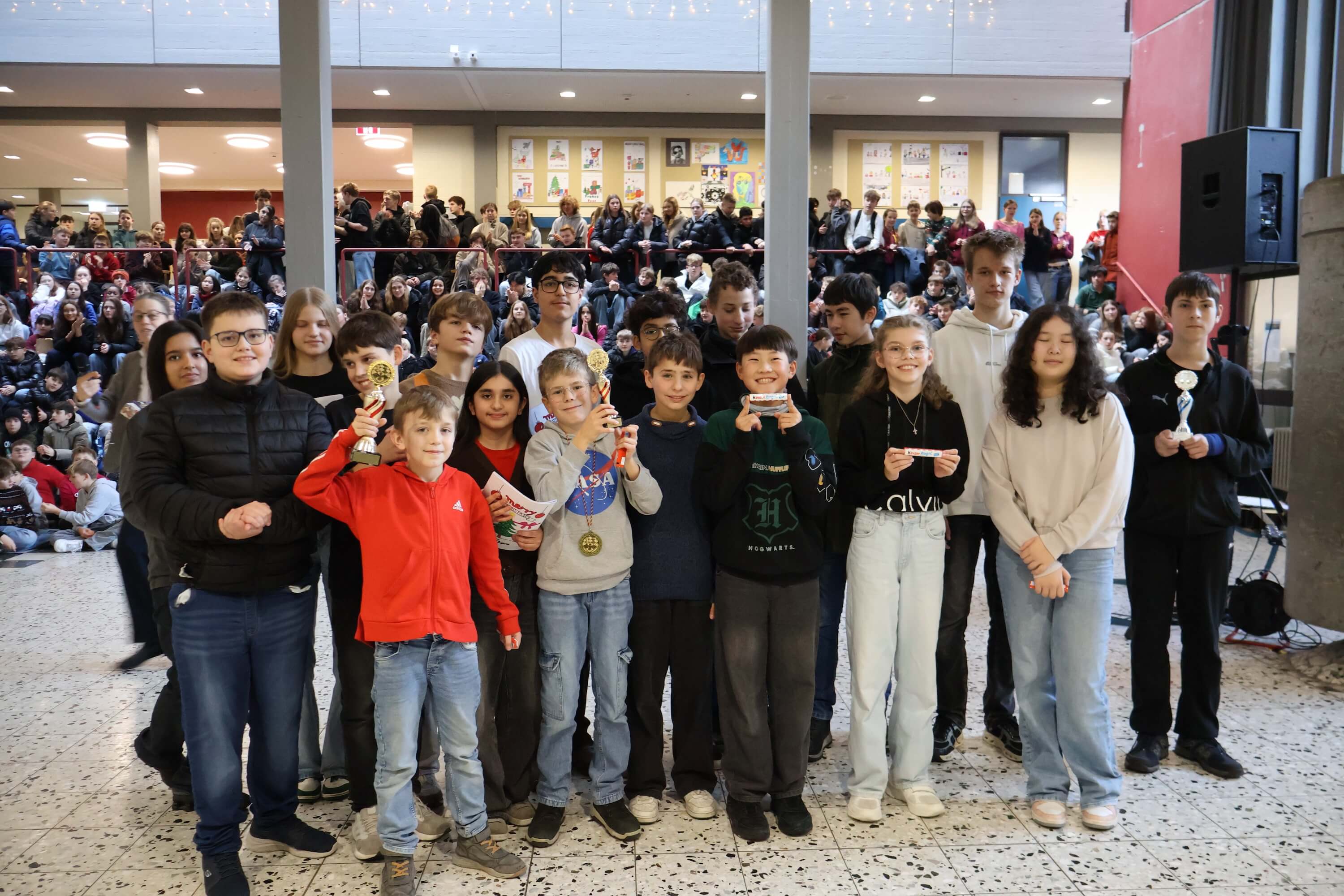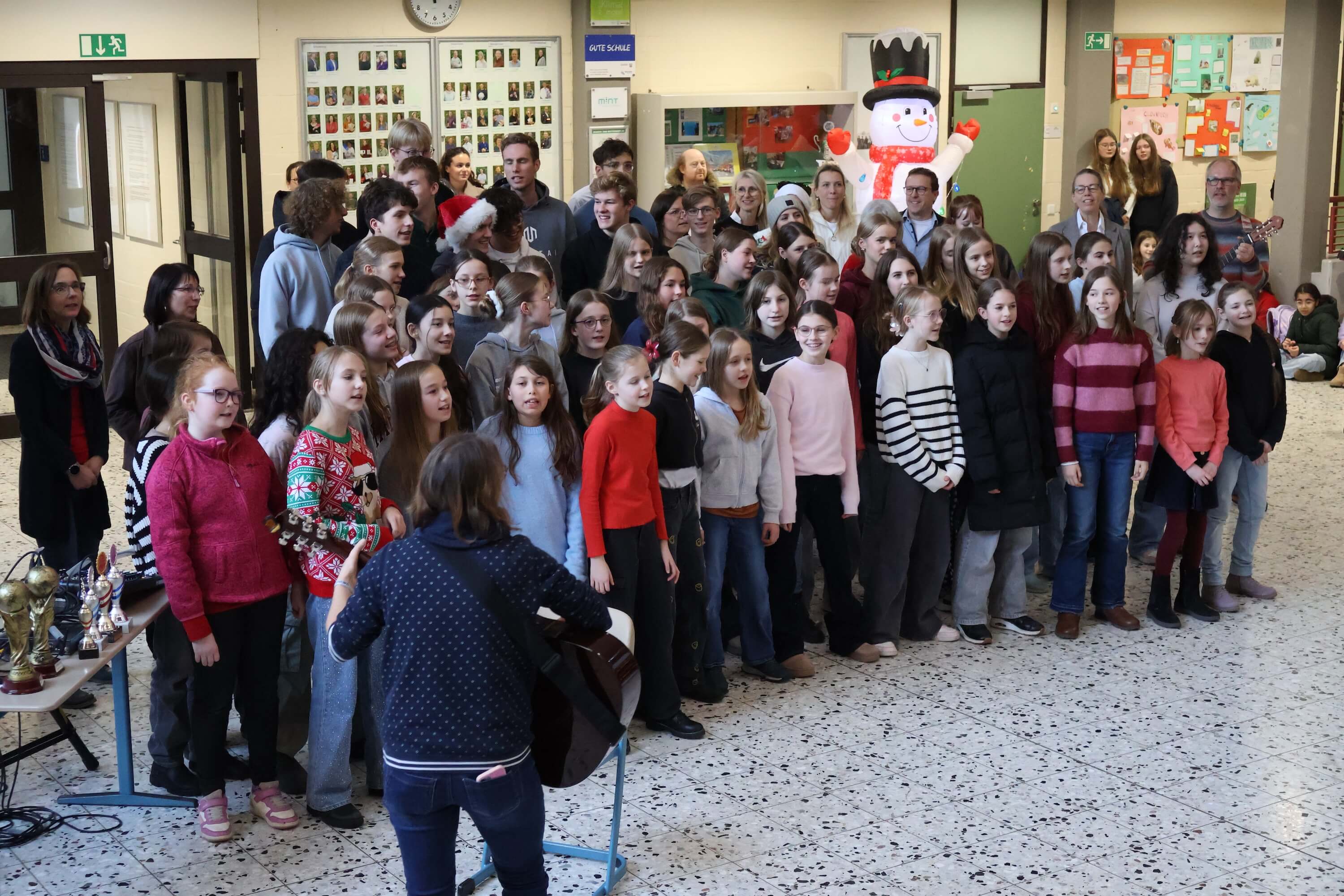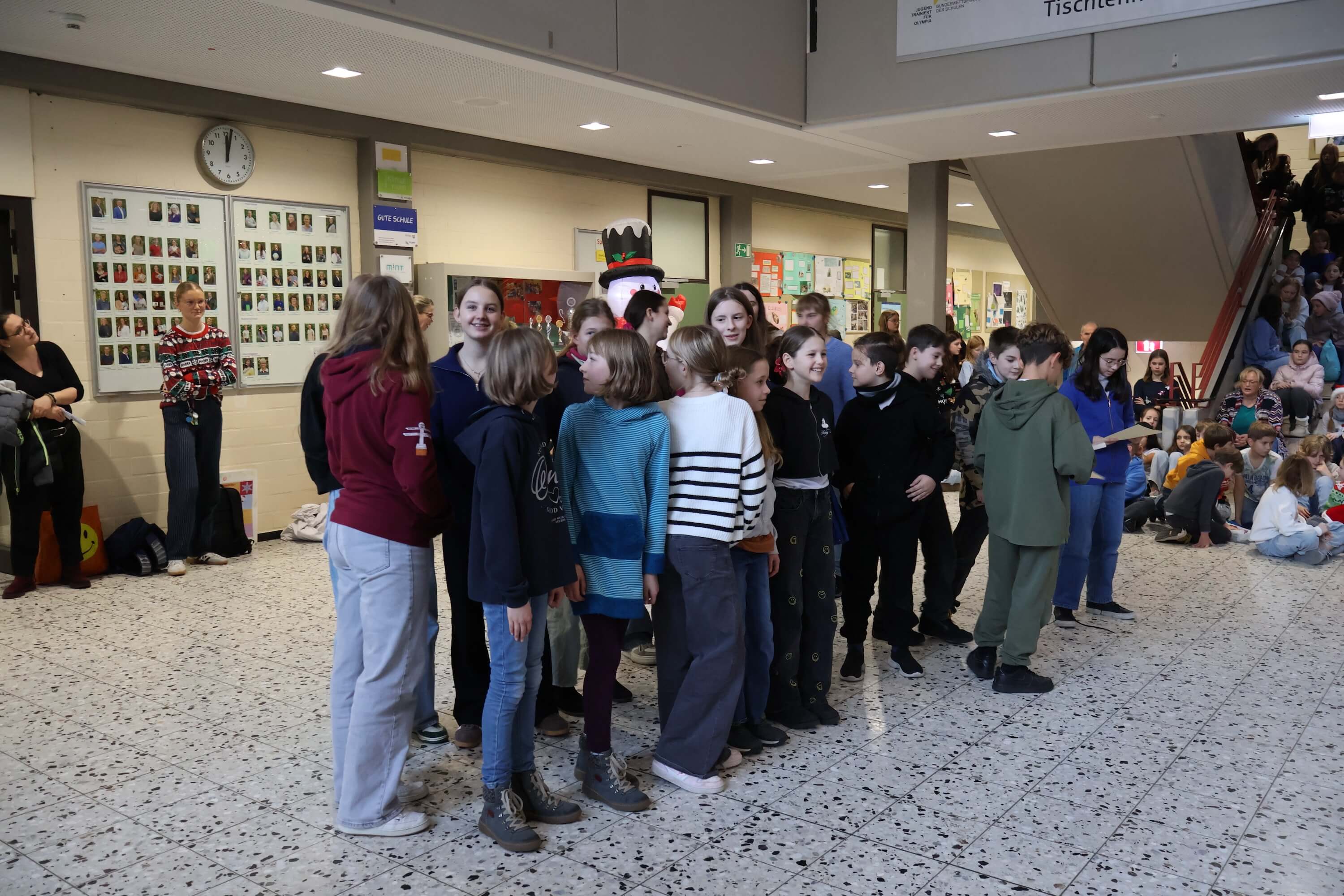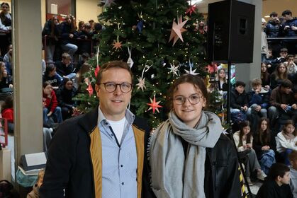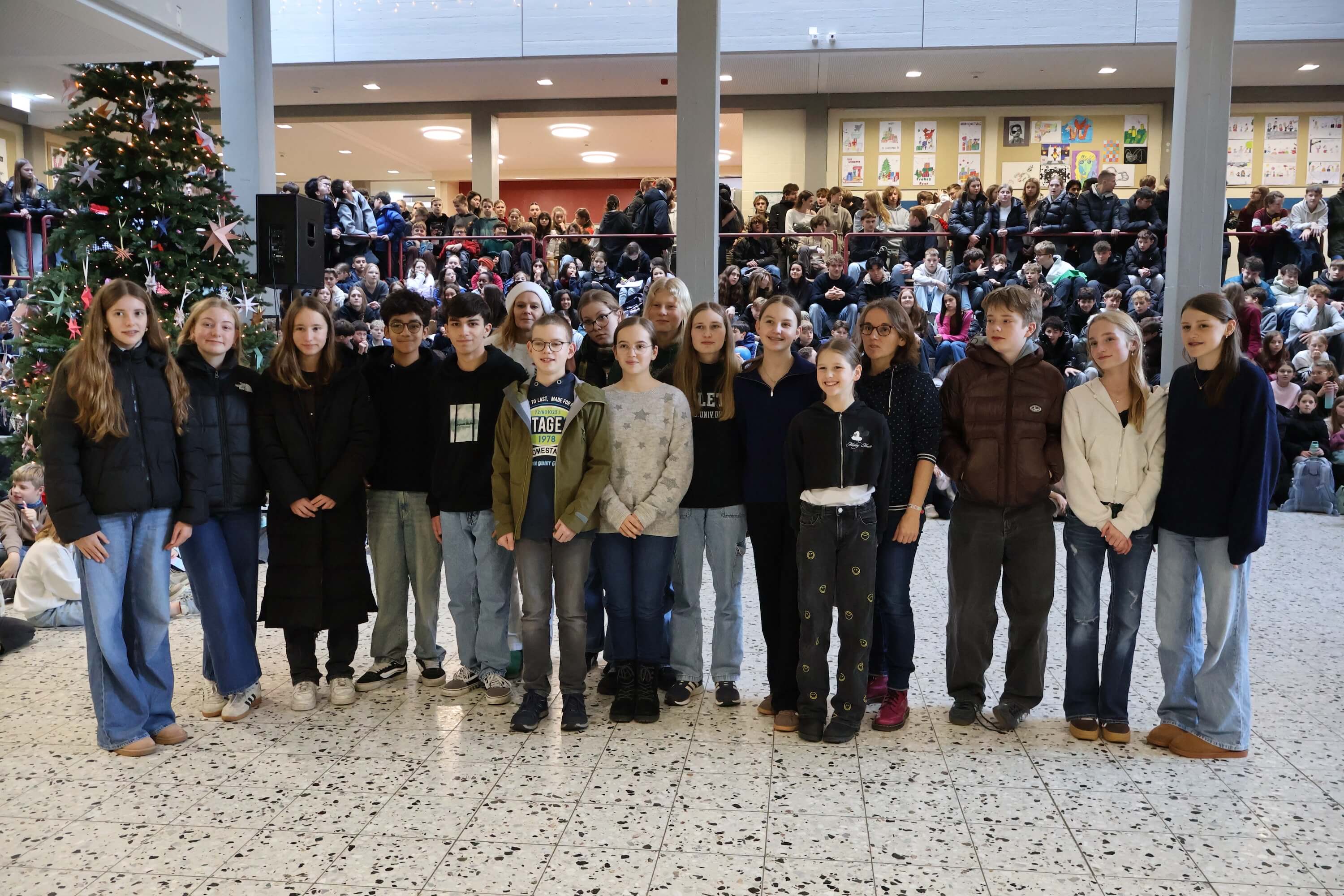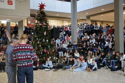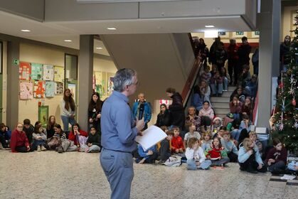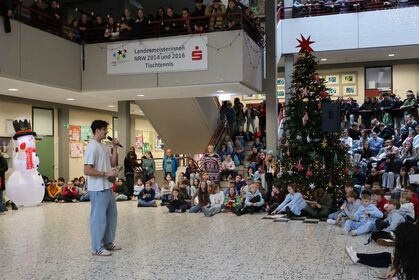 Am letzten Schultag versammelte sich die Schulgemeinschaft wieder in unserem Forum, um einen gemeinsamen Jahresabschluss zu feiern. Mit weihnachtlichen Klängen stimmte unser Kieselsteinchen- und Projekt-Chor, der sich aus Schülern und Lehrern zusammensetzt, die Schulgemeinde auf den Jahresabschluss ein.