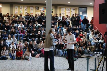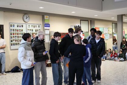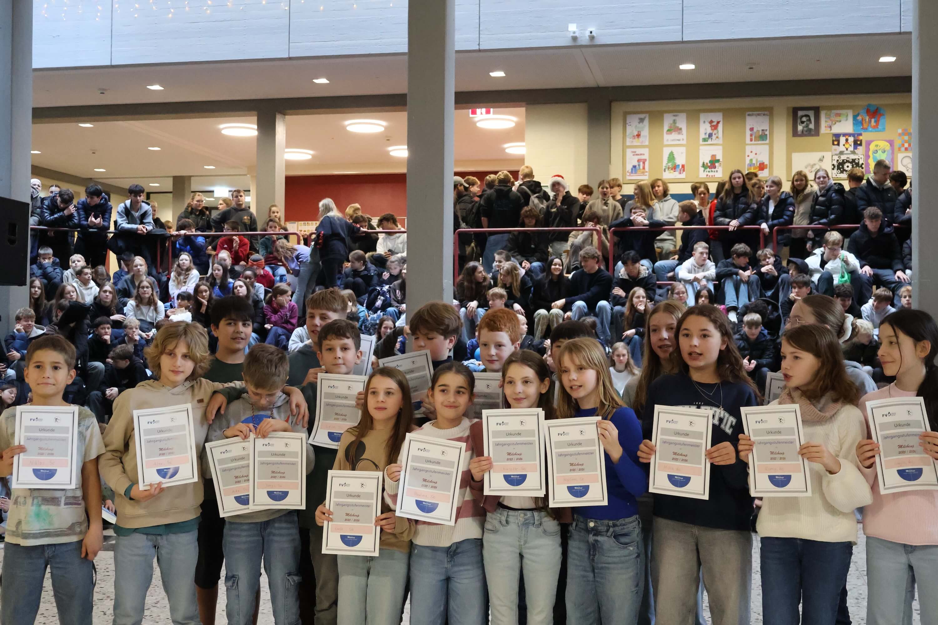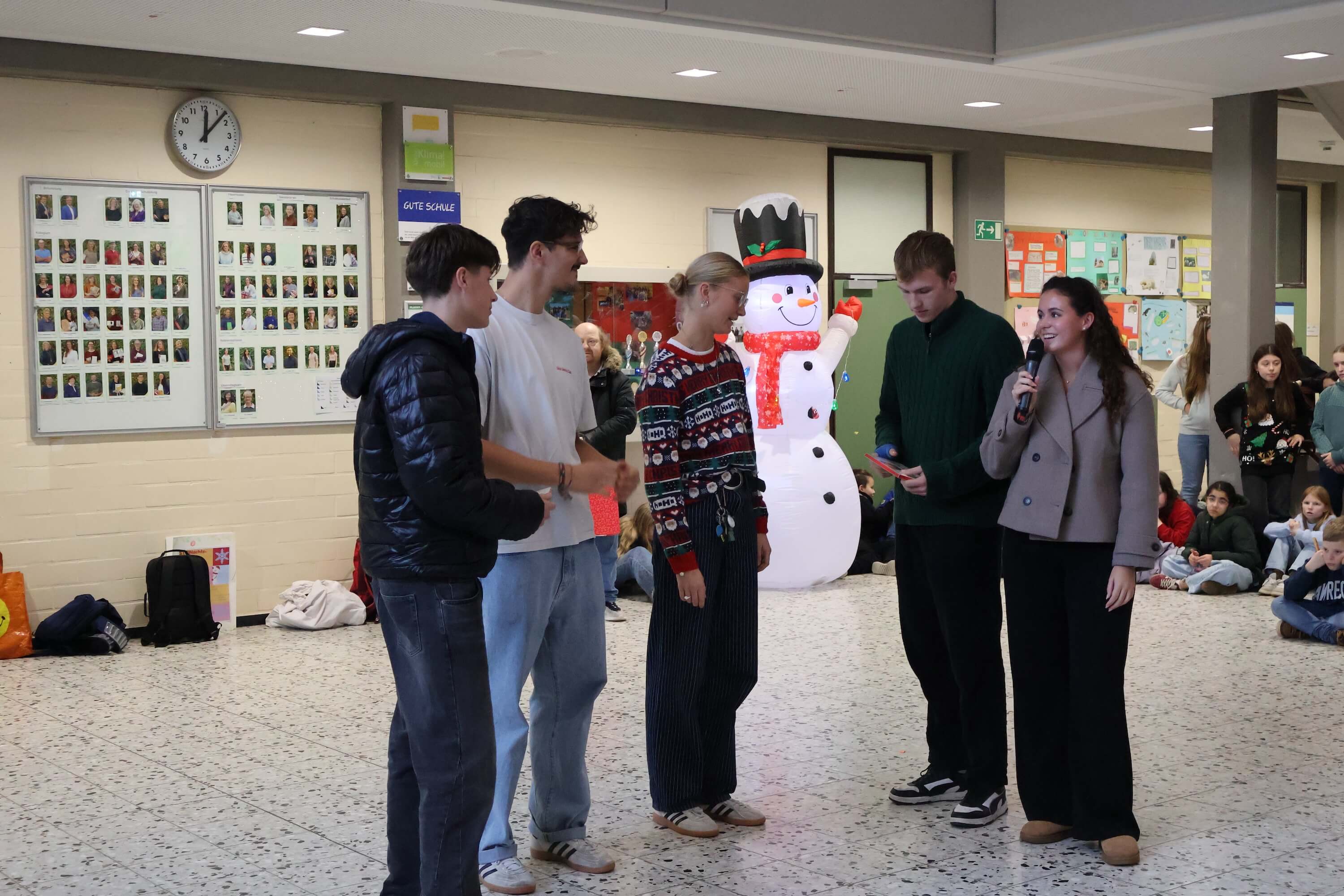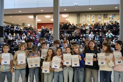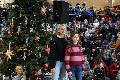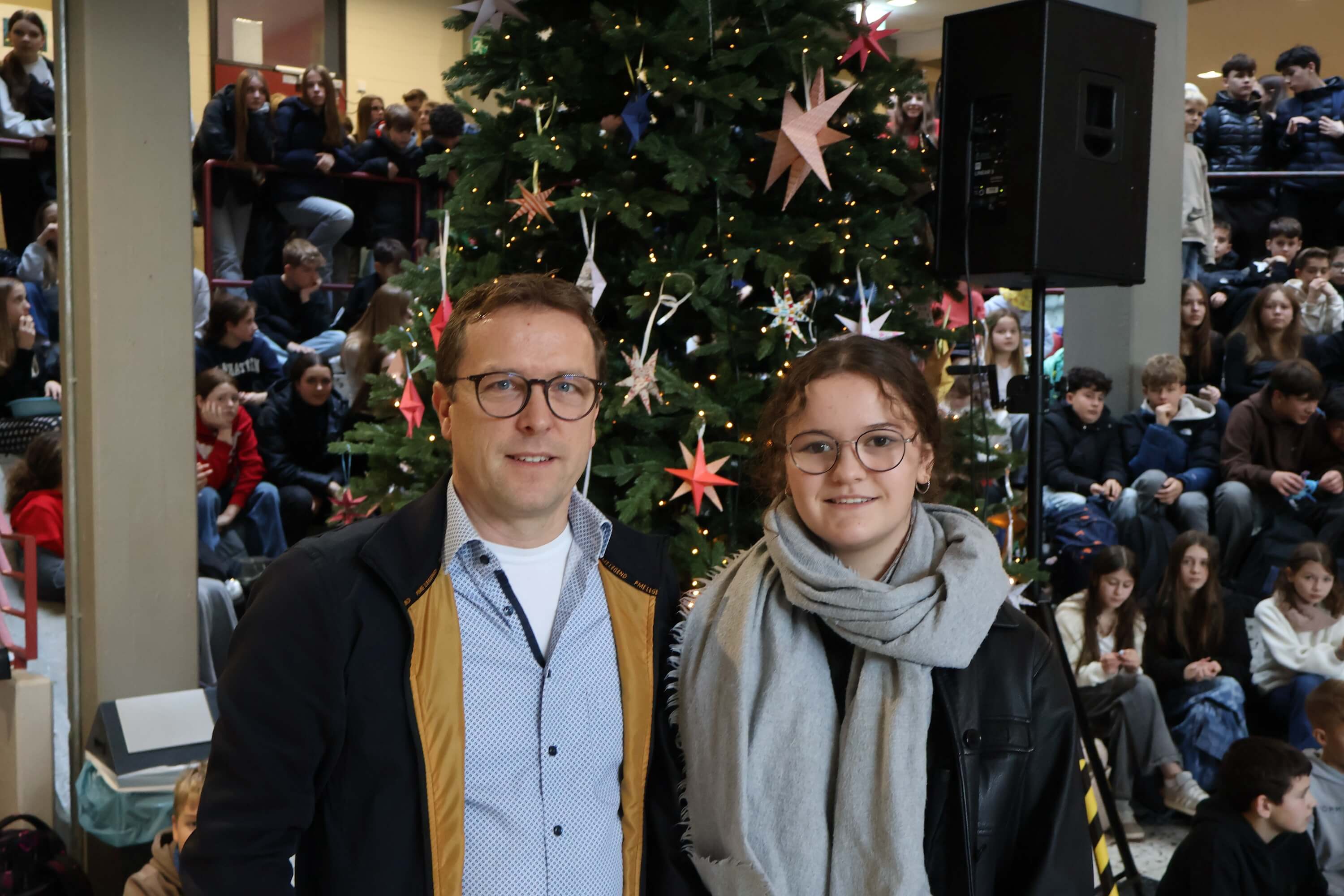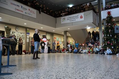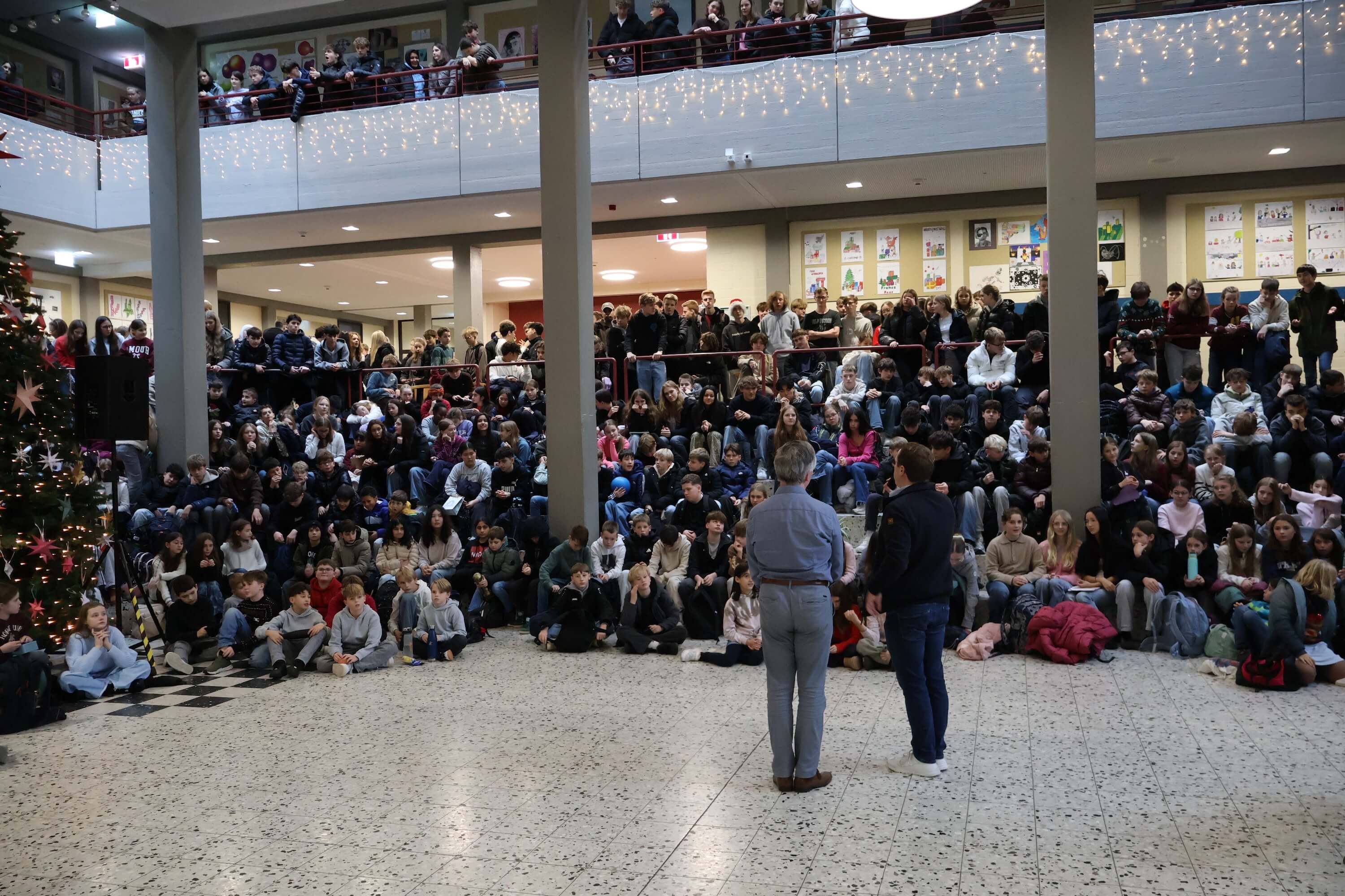 Am letzten Schultag versammelte sich die Schulgemeinschaft wieder in unserem Forum, um einen gemeinsamen Jahresabschluss zu feiern. Mit weihnachtlichen Klängen stimmte unser Kieselsteinchen- und Projekt-Chor, der sich aus Schülern und Lehrern zusammensetzt, die Schulgemeinde auf den Jahresabschluss ein.