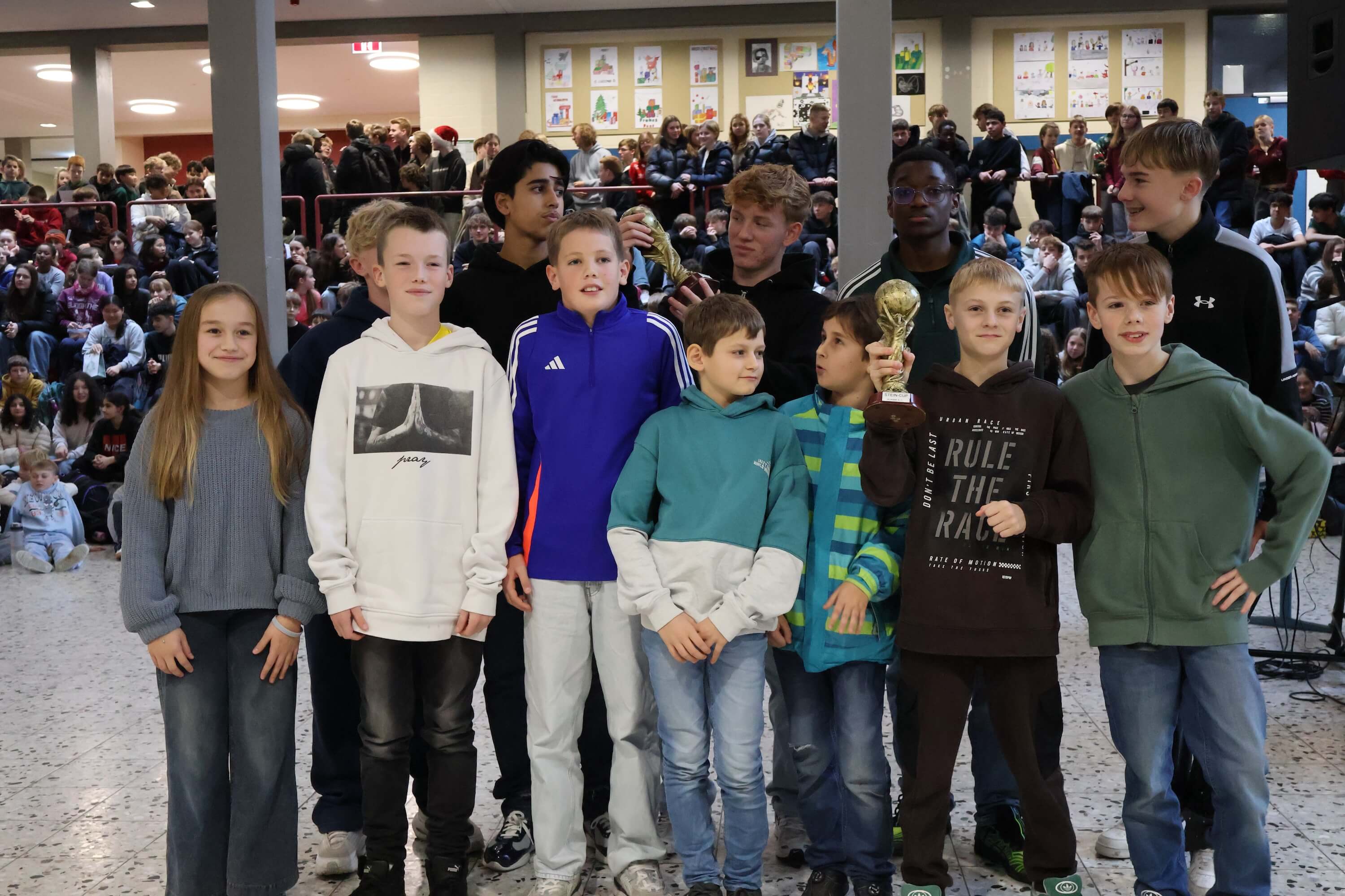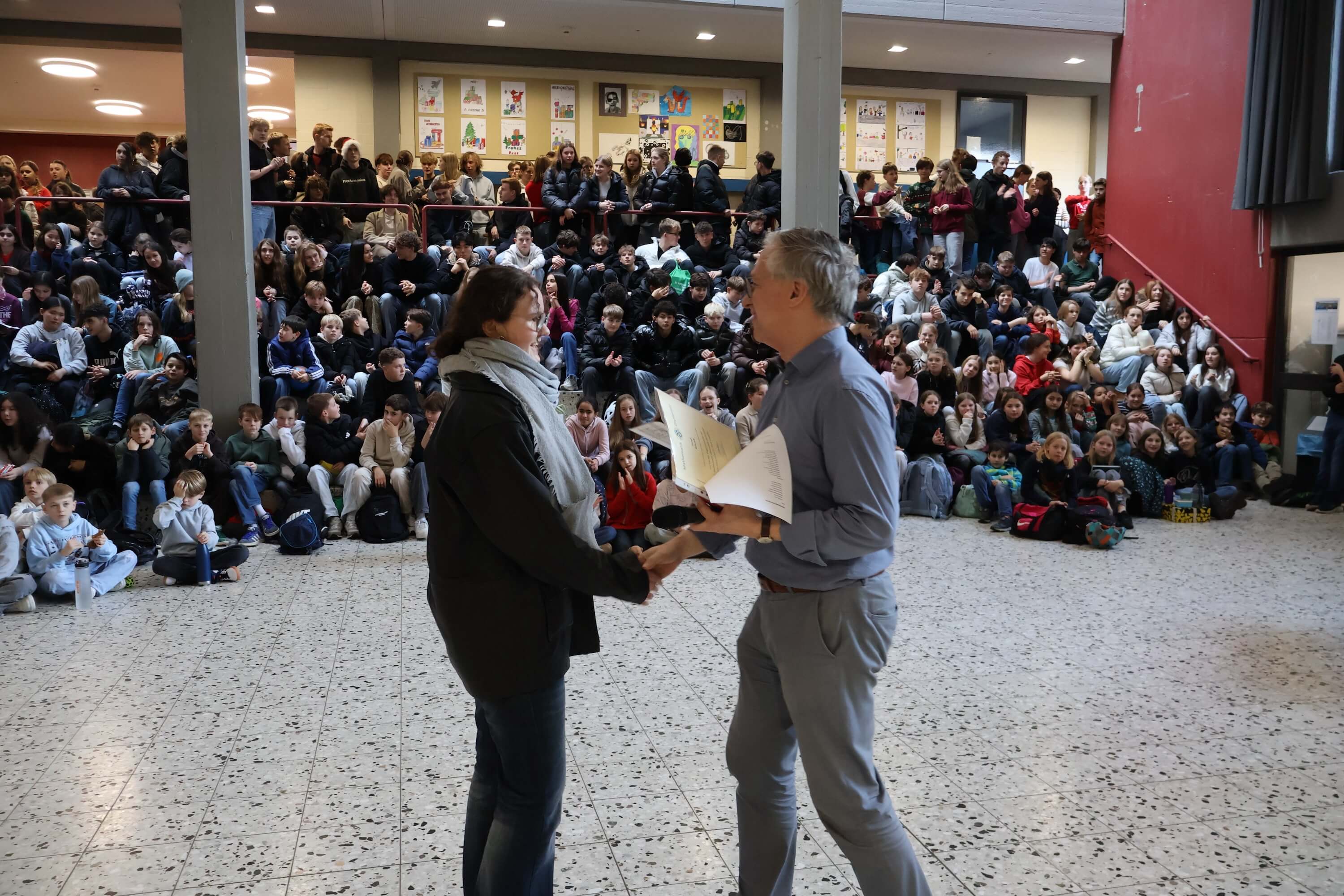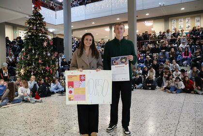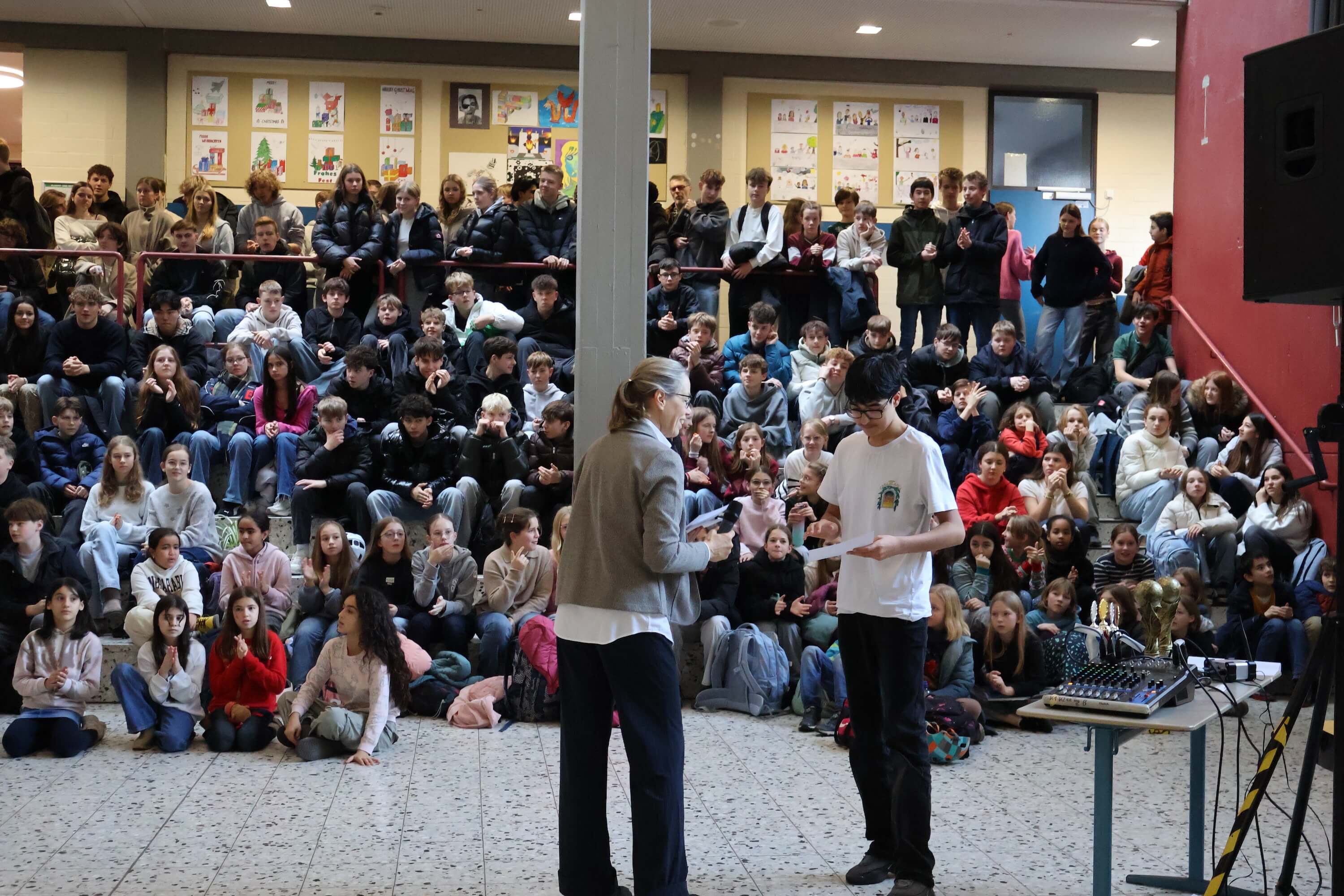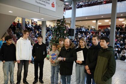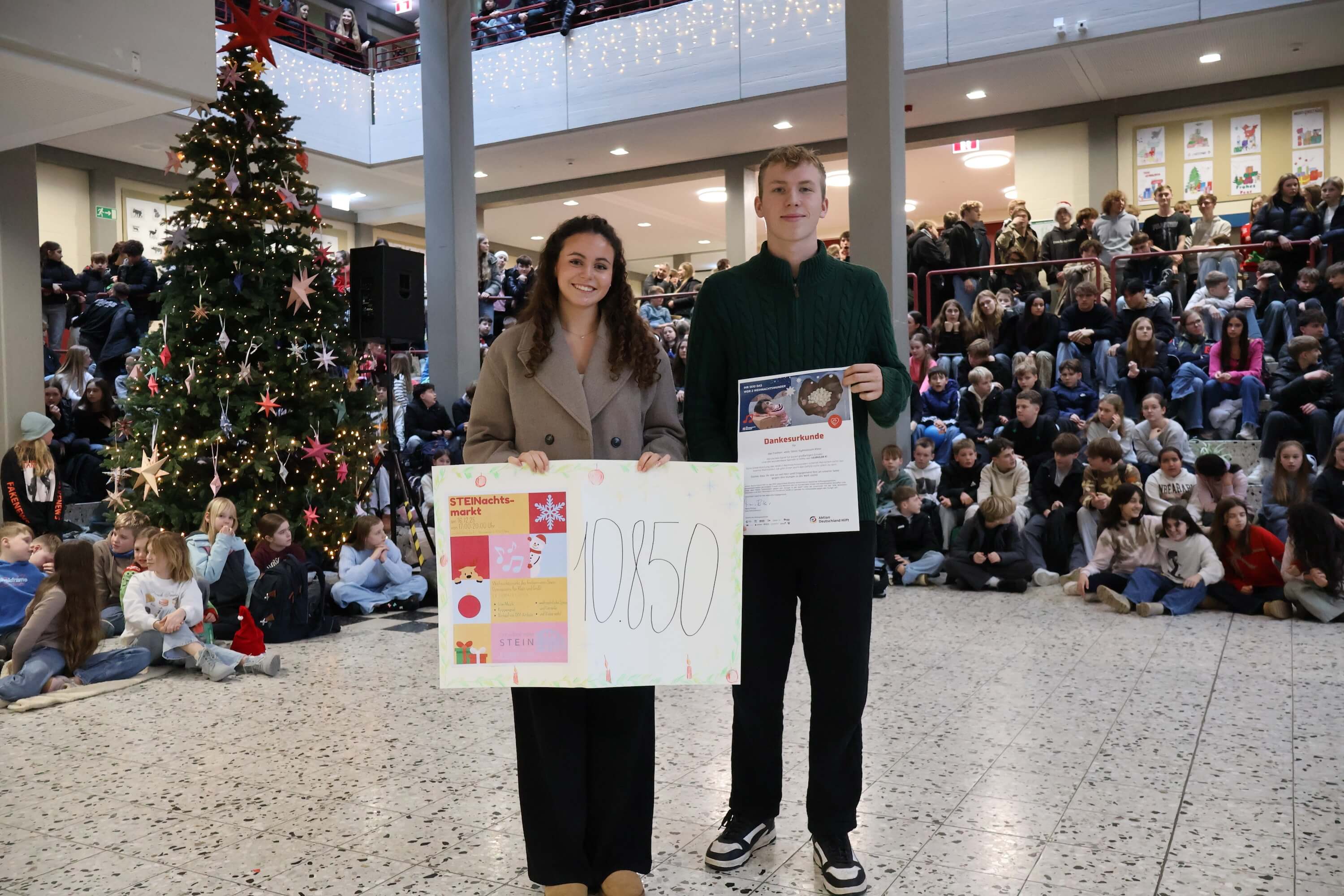 Anschließend wurden zahlreiche Ehrungen für besondere Erfolge und Leistungen vorgenommen. Neben den erfolgreichen Schulmannschaften, den Stein-Cup-Siegern und Erfolgen bei Sprachen-und Mathematik-Wettbewerben wurde der gemeinsame Erfolg unseres STEINachtsmarktes gefeiert, bei dem wir als Schulgemeinschaft 10.850 € für das WDR2-Weihnachtswunder gesammelt und gespendet haben.