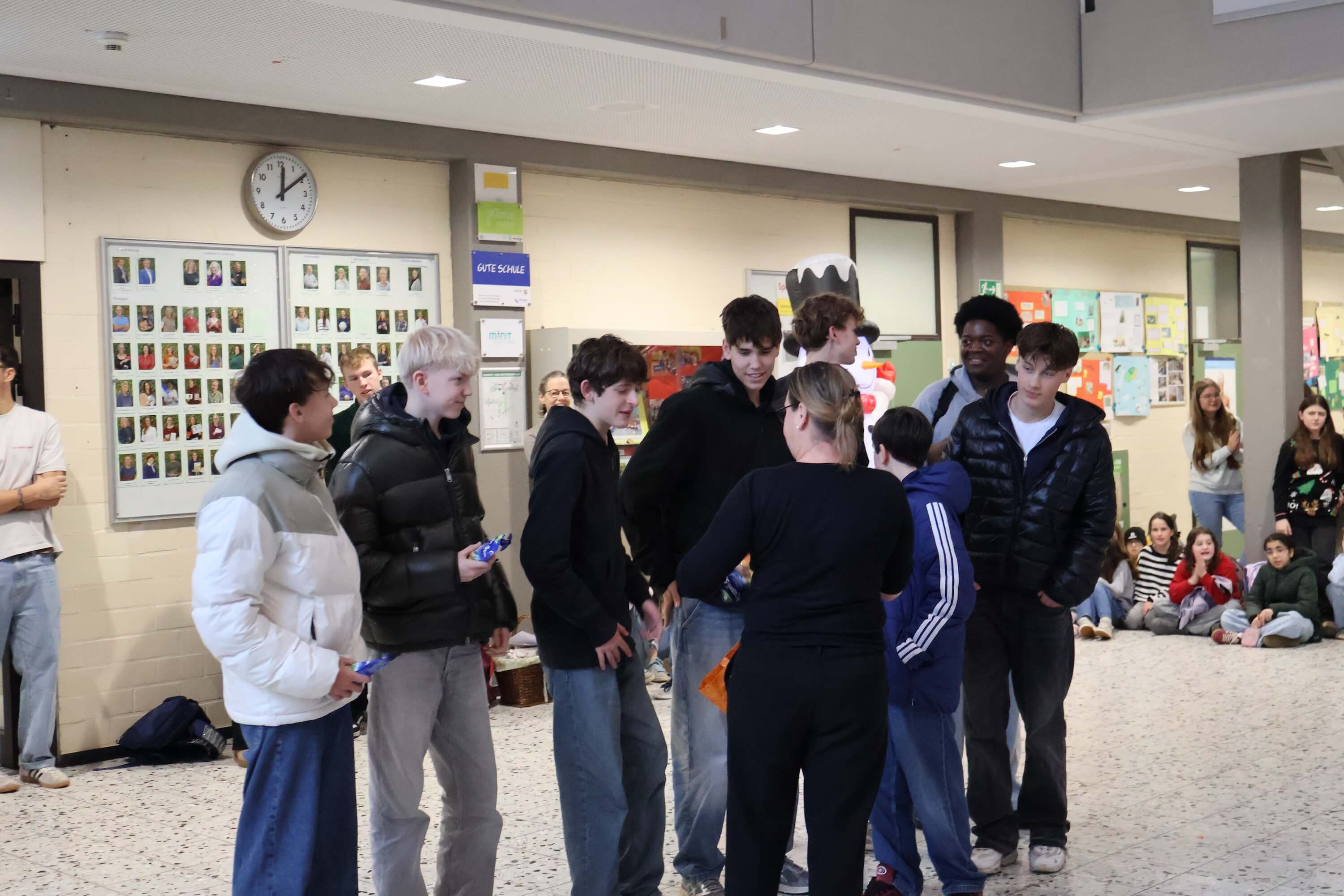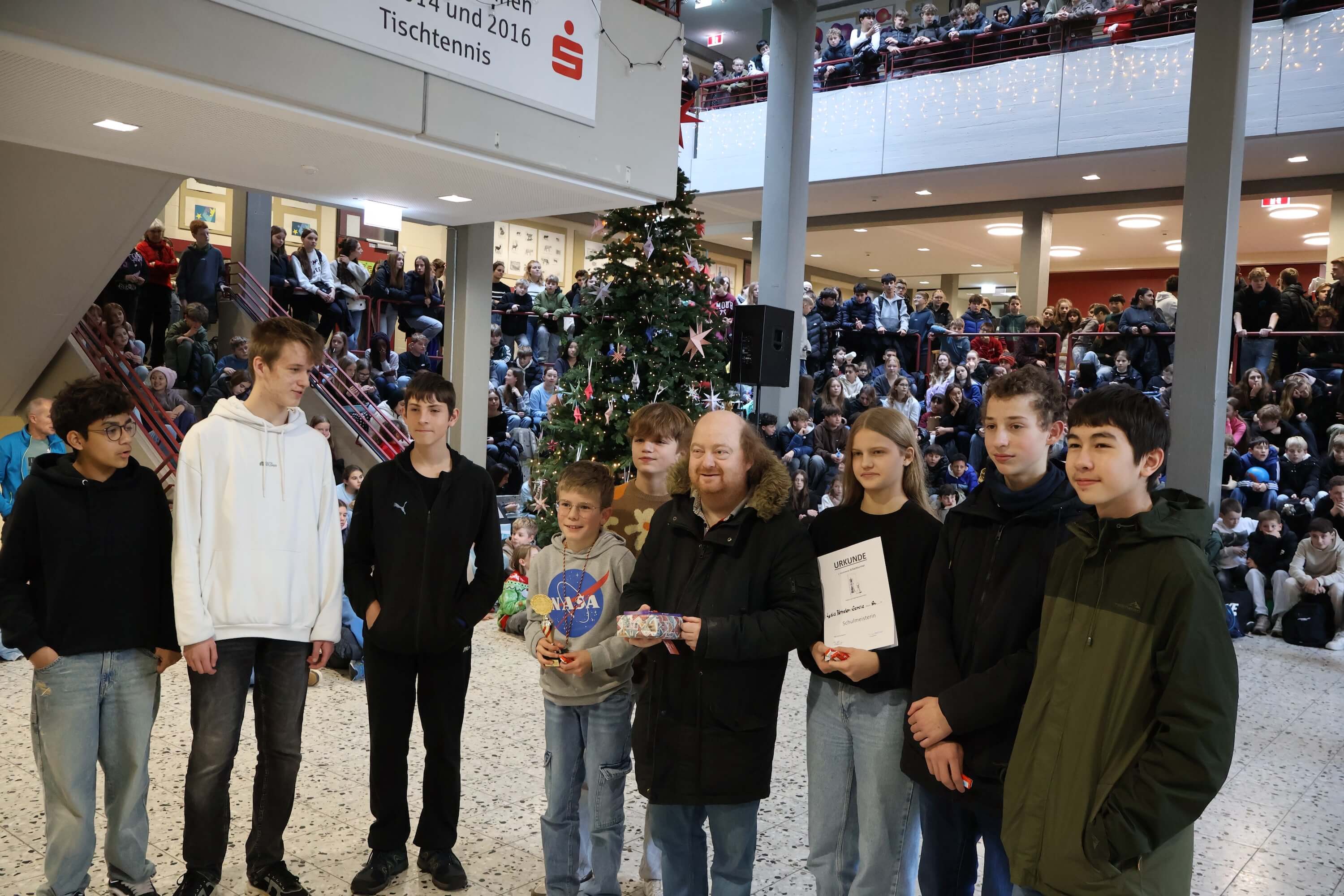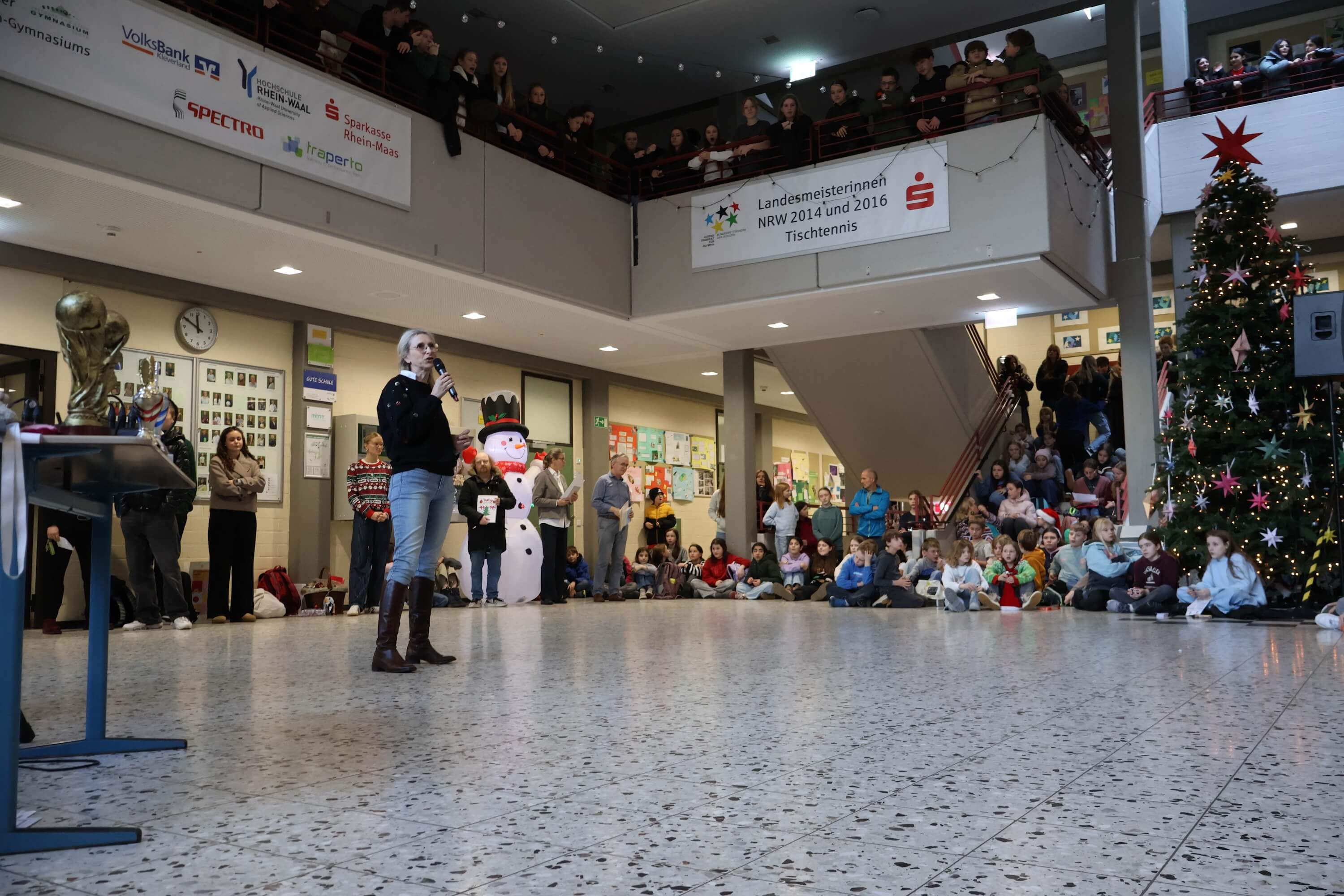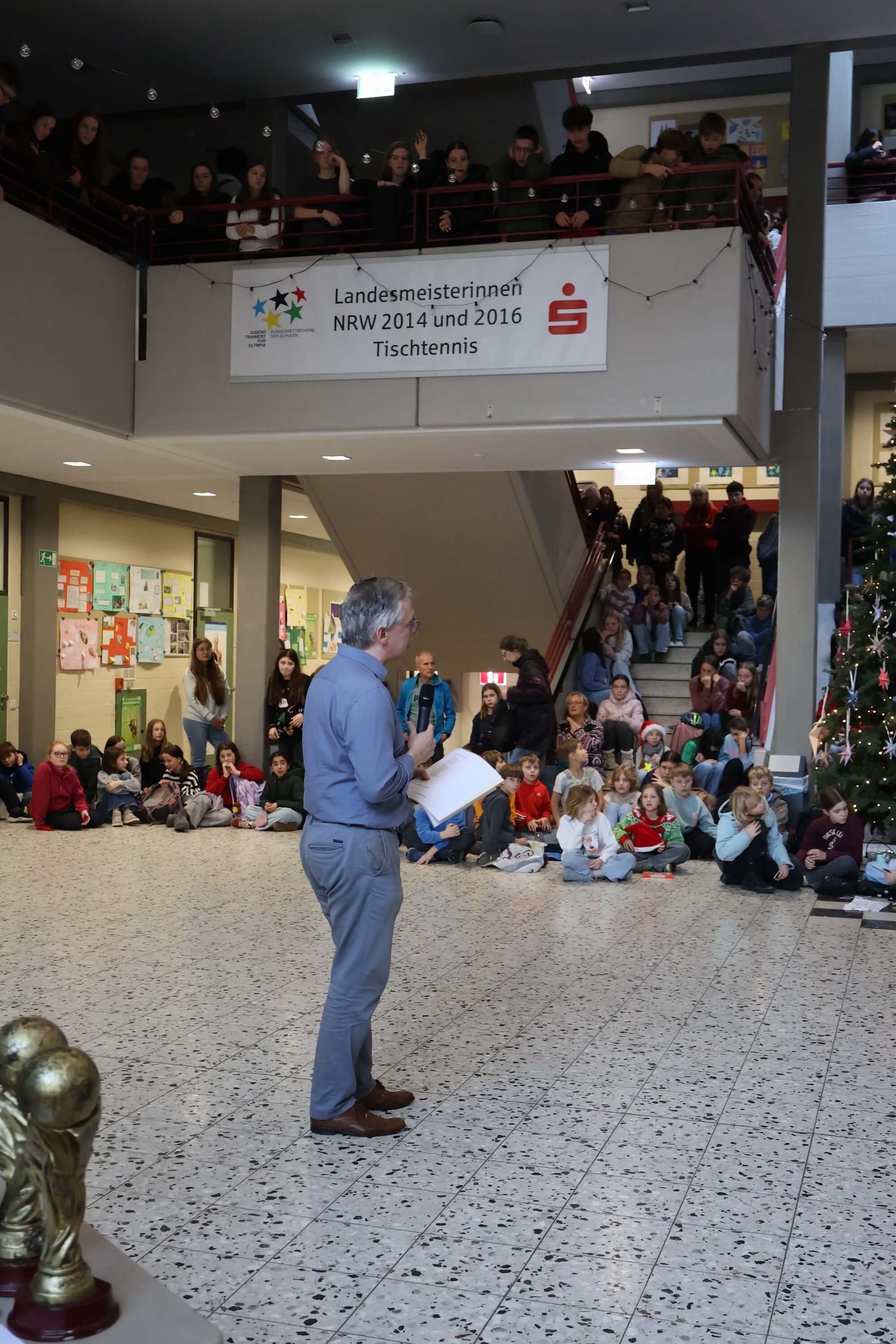 Anschließend wurden zahlreiche Ehrungen für besondere Erfolge und Leistungen vorgenommen. Neben den erfolgreichen Schulmannschaften, den Stein-Cup-Siegern und Erfolgen bei Sprachen-und Mathematik-Wettbewerben wurde der gemeinsame Erfolg unseres STEINachtsmarktes gefeiert, bei dem wir als Schulgemeinschaft 10.850 € für das WDR2-Weihnachtswunder gesammelt und gespendet haben.