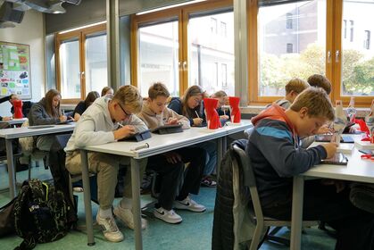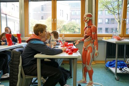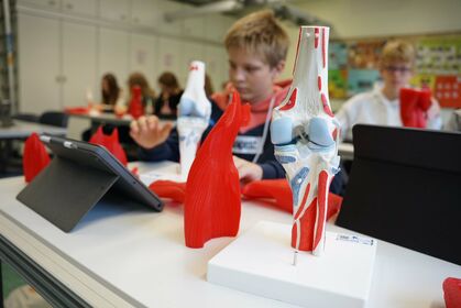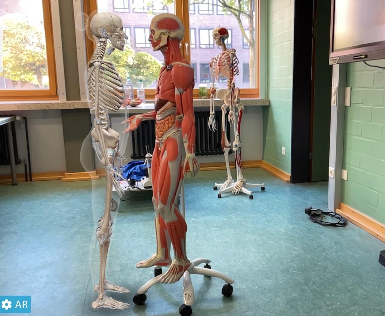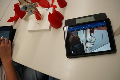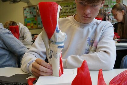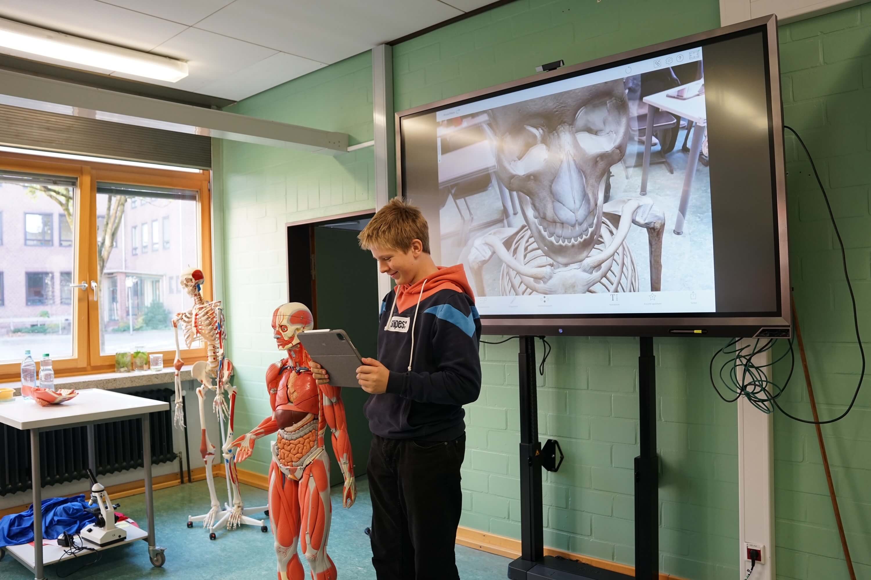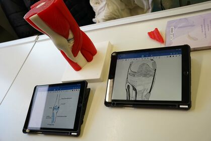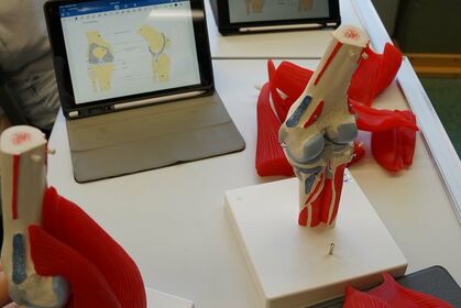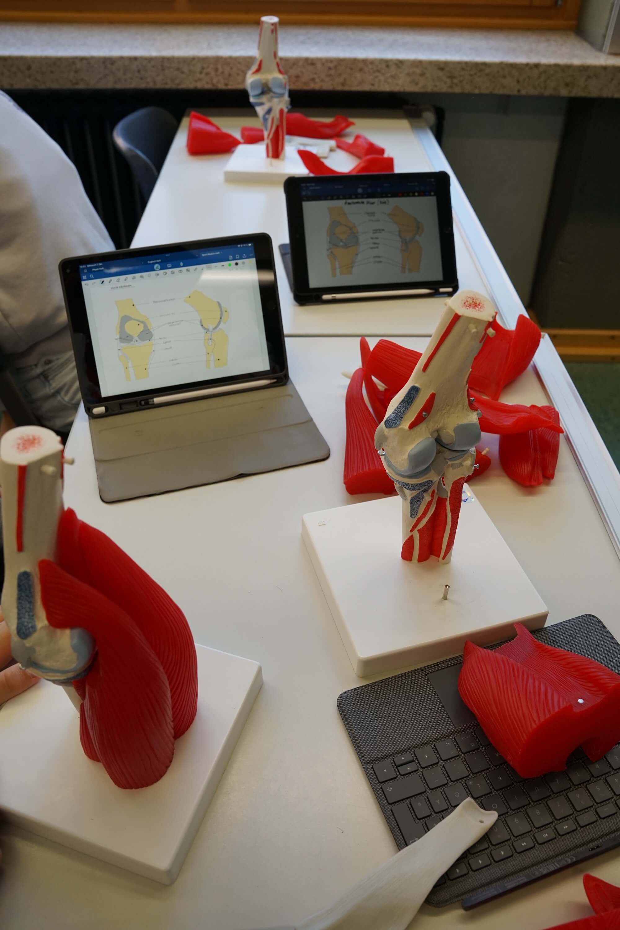 In einer ersten Annäherung wurden, ganz im Stil des berühmten Leonardo da Vinci, anatomische Skizzen angefertigt. Mit viel Konzentration, zeichnerischem Geschick und dem Einsatz von iPads wurden von den lebensechten Knie-Modellen detailreiche Zeichnungen angefertigt, die an die Arbeitsweise des Renaissance-Genies erinnerten. Mithilfe von Augmented-Reality-Anwendungen konnten die Schülerinnen und Schüler zudem das Kniegelenk virtuell im Raum erscheinen lassen und die Funktionsweise erkunden.
