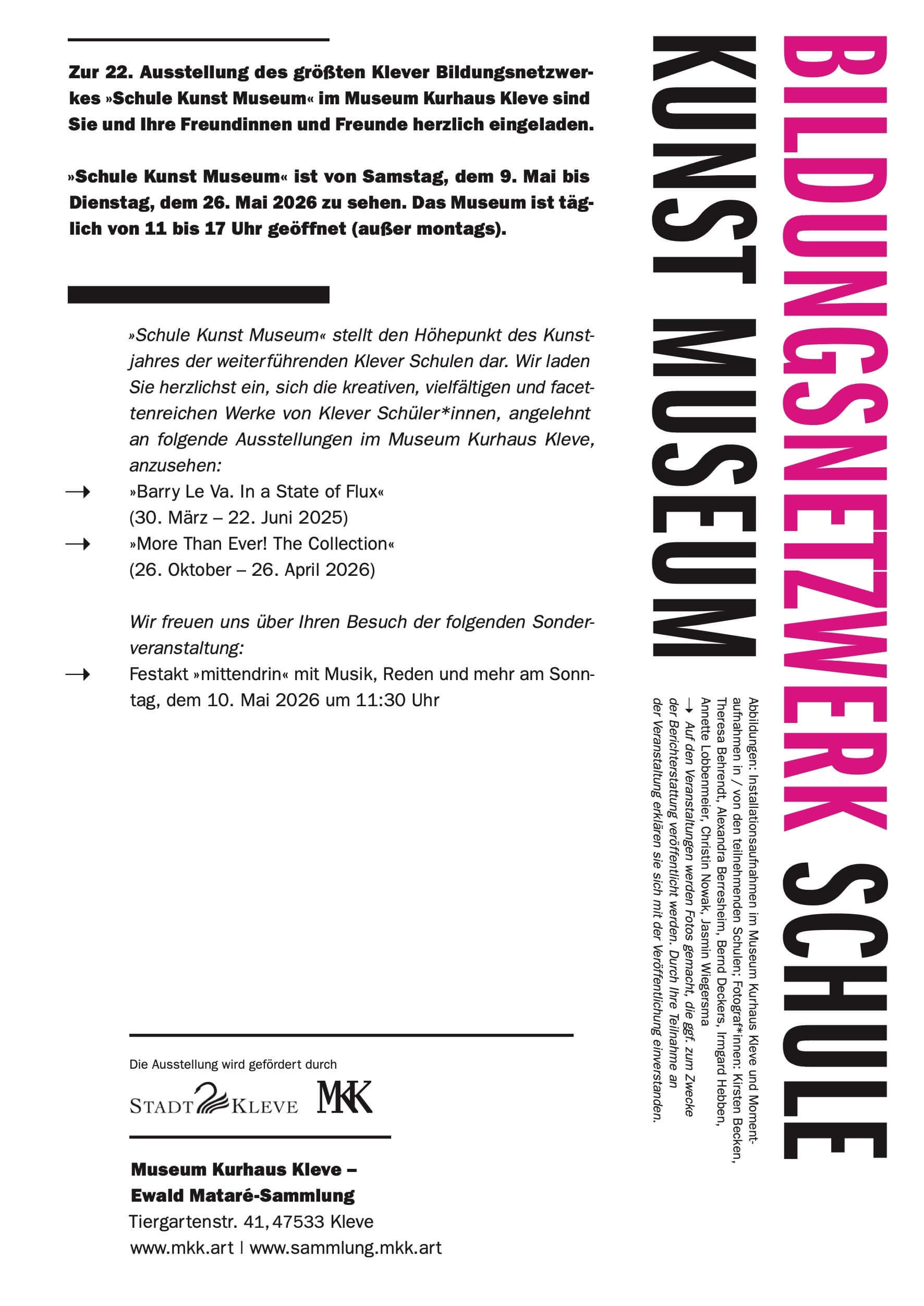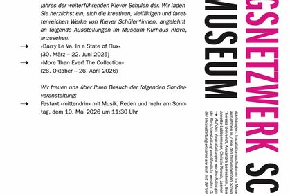 Die Ausstellung „Schule Kunst Museum“ lädt vom 9. bis 26. Mai 2026 ins Museum Kurhaus Kleve ein.