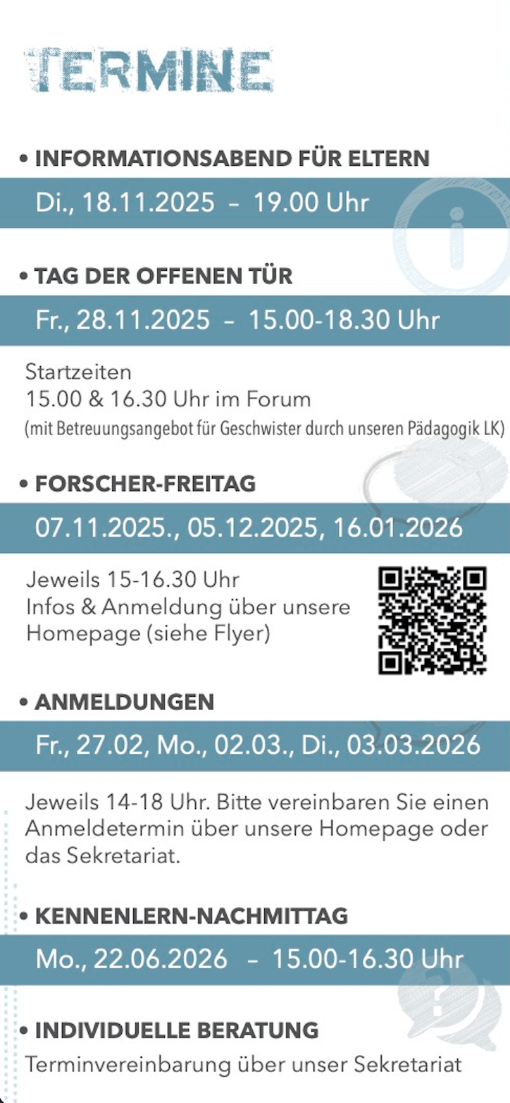 Falls Sie einen Newsletter mit aktuellen Informationen rund um den Tag der offenen Tür, zum Elternabend und zum Schnupper-Nachmittag sowie über das Anmeldeverfahren 2026 erhalten möchten, können Sie diesen hier abonnieren. (Die Daten werden selbstverständlich nur zu diesem Zweck verwendet, nach dem Anmeldeverfahren gelöscht und nicht an Dritte weitergegeben.)