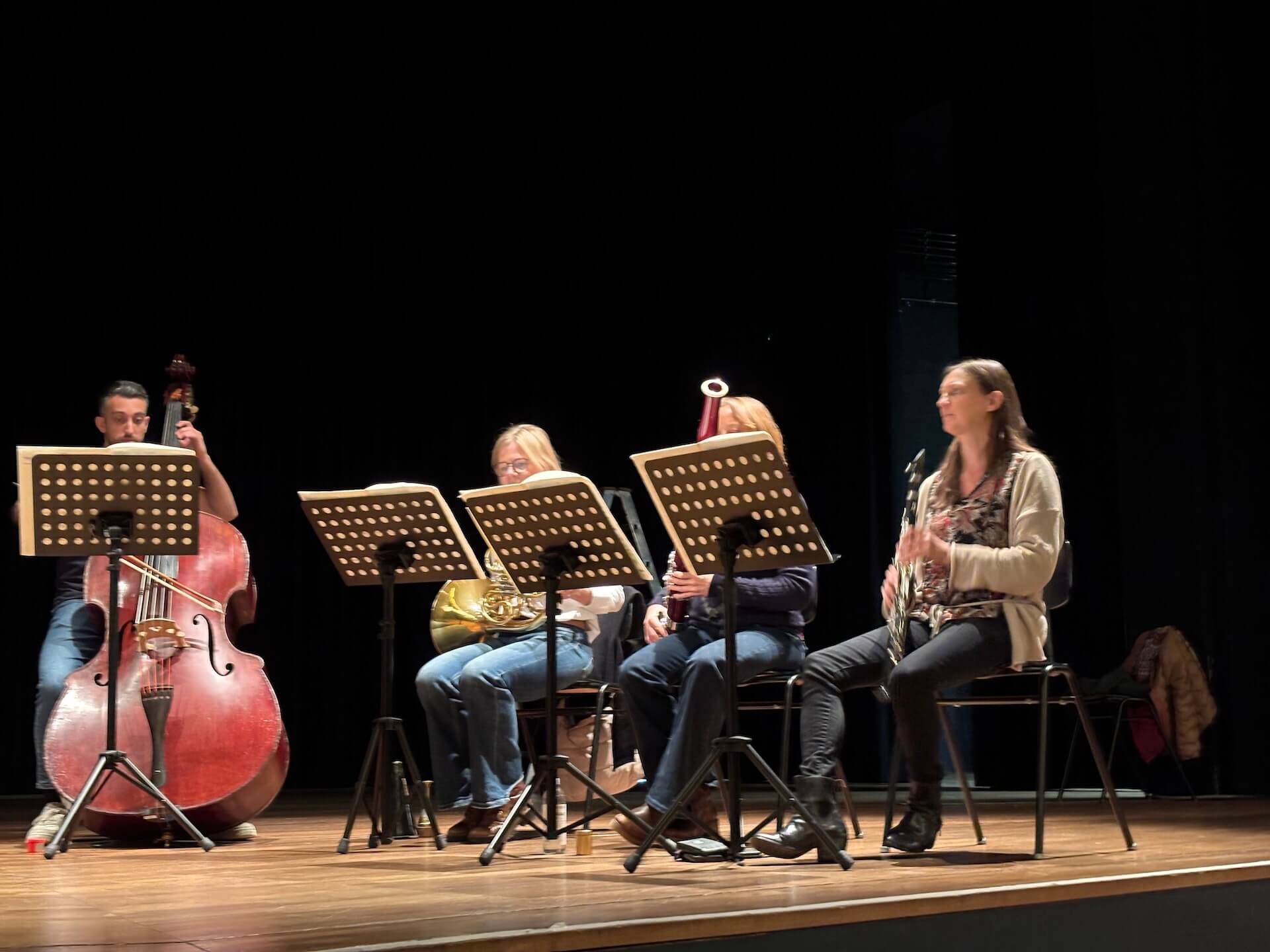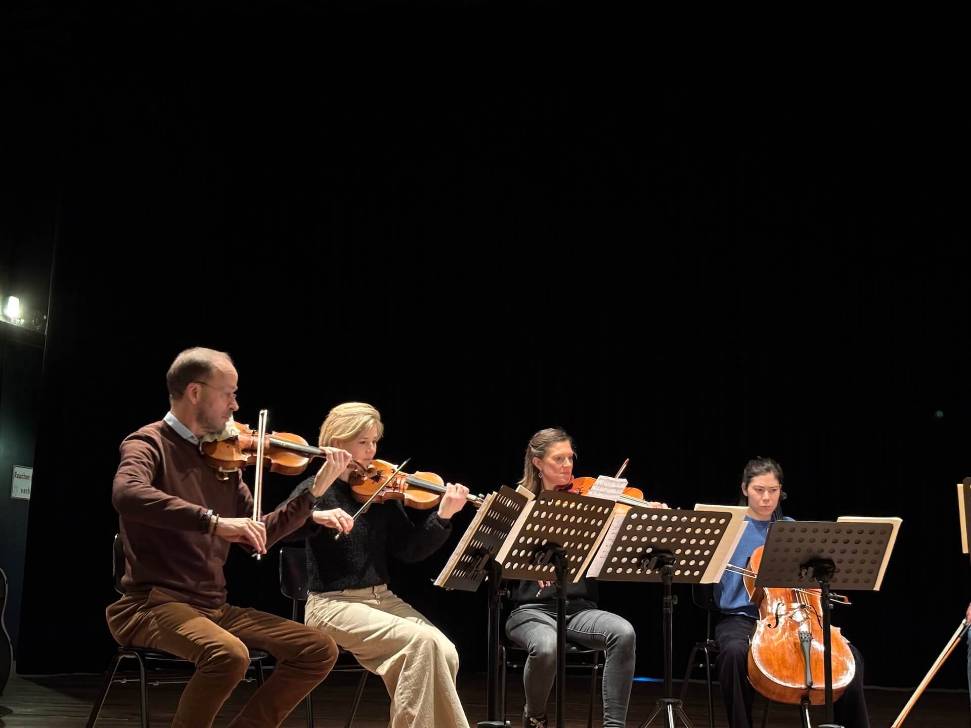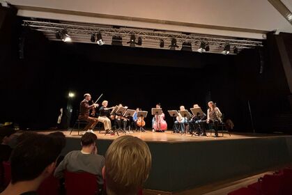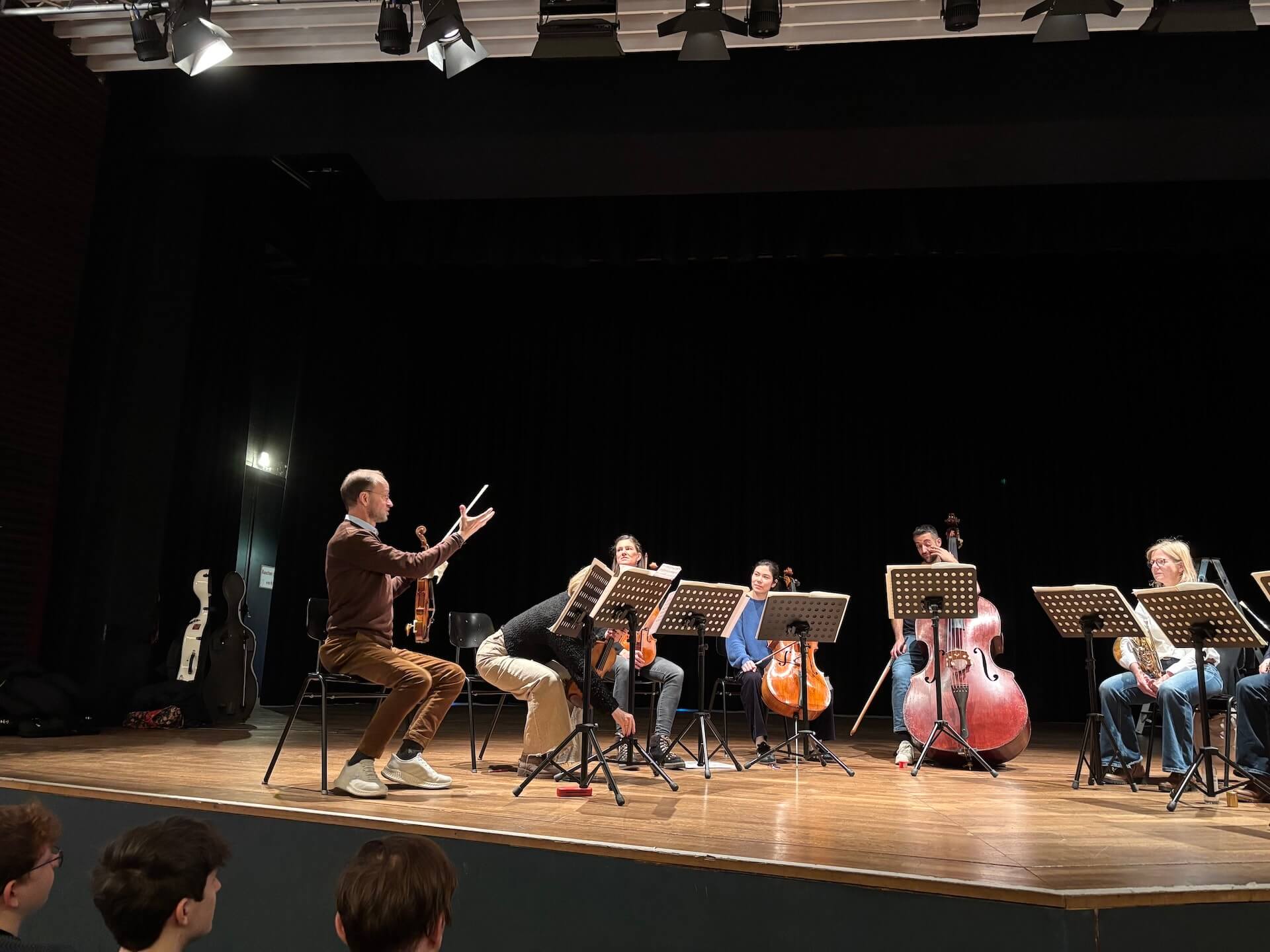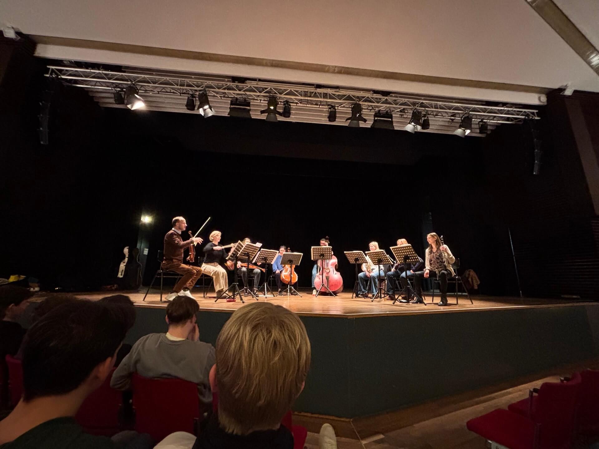 …und wie die Profis üben, konnten die Schülerinnen und Schüler unserer Schule und des Konrad-Adenauer-Gymnasiums, die gemeinsam den GK Musik Q1 von Herrn Lange besuchen, am Dienstag in der Klever Stadthalle live erleben. Frau Krauledat, die künstlerische Leiterin der Konzerte der Stadt Kleve, stellte den Kontakt her und so wurde der Besuch einer Probe für das Konzert des Oktetts des Bayrischen Radio-Symphonieorchesters ermöglicht. Neben der Beobachtung des Oktetts gab es aber auch einen regen Austausch zwischen den Schülerinnen und Schülern und den Musikerinnen und Musikern, bei dem vieles über die Stücke, die Arbeit Profimusiker und natürlich auch den Werdegang dahin zu erfahren war.